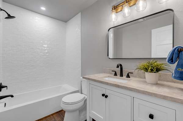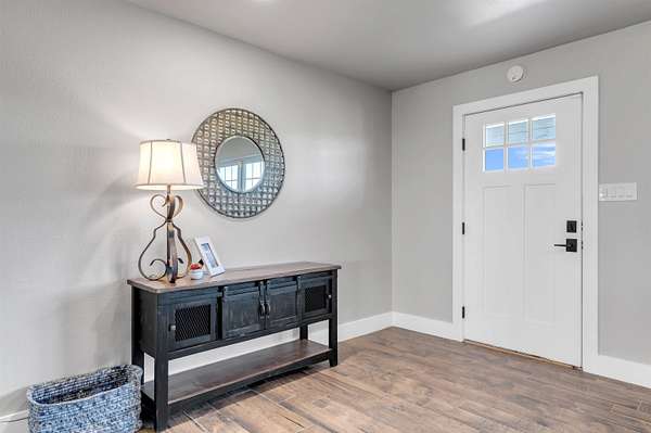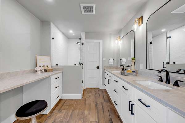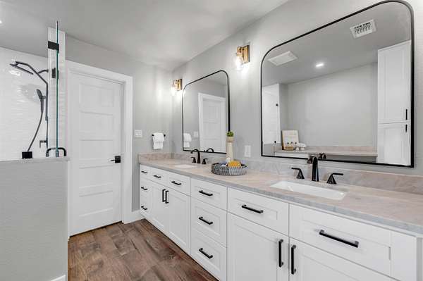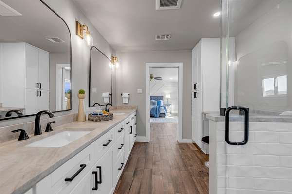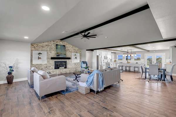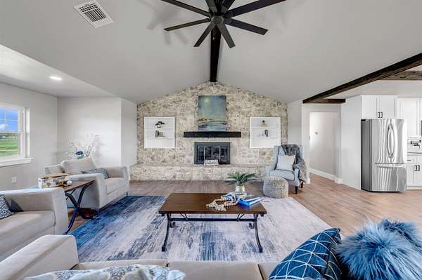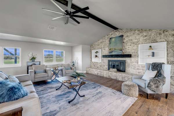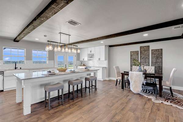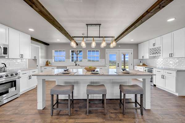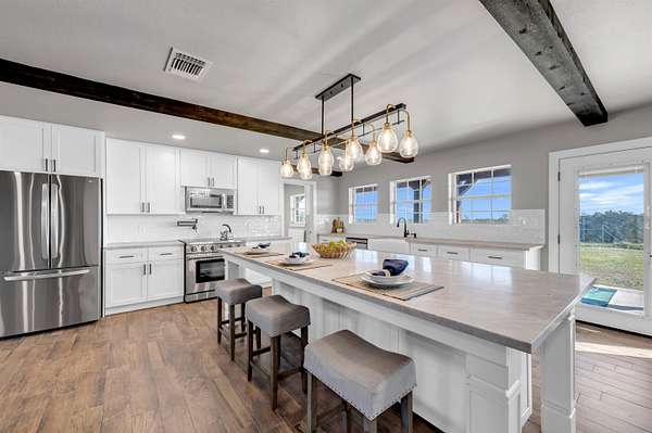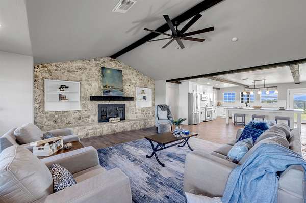 Completely Remodeled Modern Farmhouse home in the beautiful Hill Country of Marble Falls nestled on 2 completely fenced acres with gate. The views are amazing. This 4 bedroom/3 bath home has a touch of country with a splash of elegance. As you enter the front door you are met with expansive wooden rustic beams, elegant wood look tile at your feet and rock against the fireplace wall that ties that home feel all together. The designer has brought in open concept making the flow flawless. There is room for your farmhouse table and bar stool at the enormous Kitchen island, that is adorned with Taj Mahal Leathered Quartz. There is storage at every turn, down to the wine bar, and every cook's dream of deep pull out drawers. The kitchen is topped off with large farmhouse sink, Pot filler over the range, wine fridge, beautiful lighting and Large Pantry/laundry room to the side and a mud area coming in the side door! The Windows allow the outside to collide with inside living. The Large Master Suite provides privacy down the hall with large walk-in closets and built in office area. Master Bathroom has large walk-in shower, rainwater heads, double sinks, with a vanity area and Taj Mahal leathered granite continued throughout all bathrooms. At the opposite end of the house is another En-suite, and two more bedrooms. 2500 Gallon Well Storage Tank, Large Covered Parking with back entry to house.