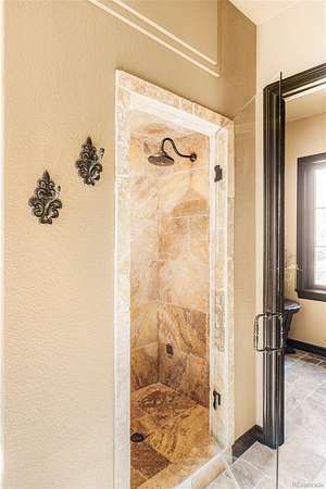 The primary suite offers a luxurious private retreat, complete with a dedicated seating area and custom stone fireplace, spa like features with travertine marble heated floors, steam shower and an expansive walk-in closet.