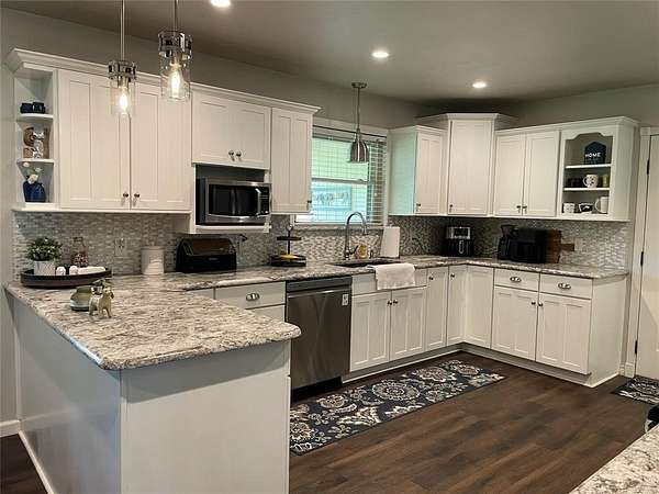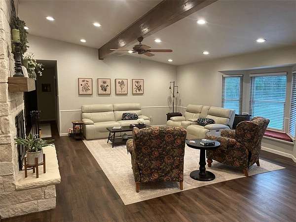 Step inside to a warm and inviting floor plan featuring a large living area with a beautiful stone fireplace, luxury vinyl plank flooring throughout, and recessed lighting. The spacious kitchen is perfect for entertaining or relaxed family living, offering granite countertops, ample cabinetry, and generous counter space. A separate dining room and an additional flex room--ideal as a media room, 4th bedroom, or office--add to the home's functionality.