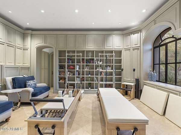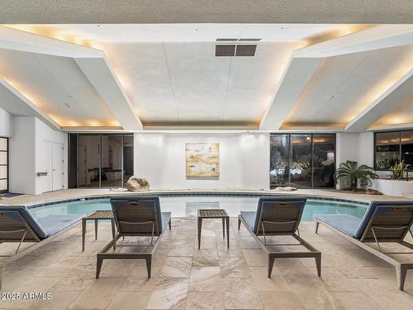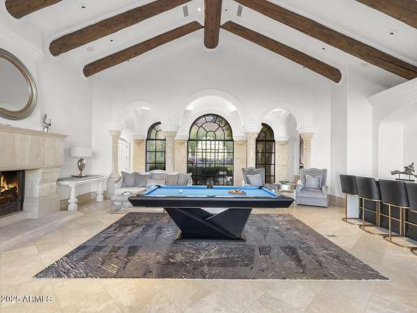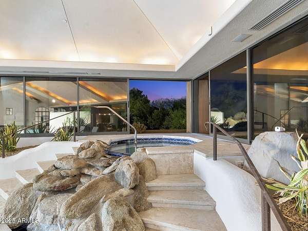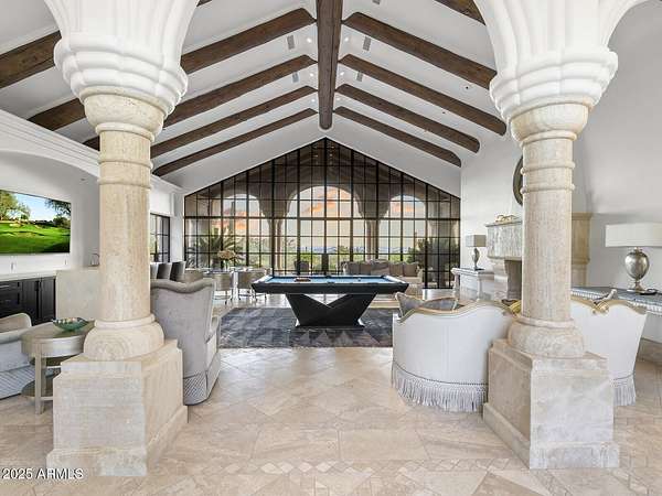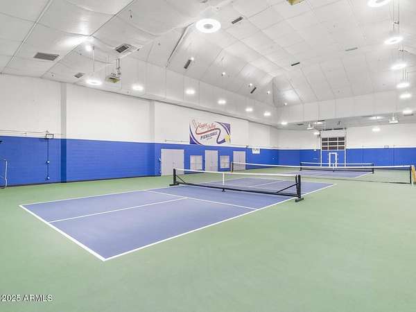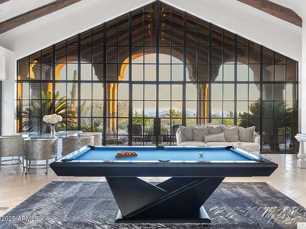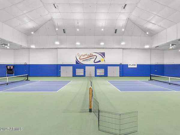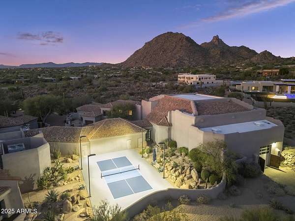 Privately gated at the base of Pinnacle Peak, this nearly seven-acre estate offers sweeping city-light and mountain views with unmatched privacy. A long, estate-style drive leads to a motor court surrounded by sunsets and open desert scenery. The 9,845 sq ft main residence is accompanied by two fully self-contained guest homes of approximately 900 sq ft each, complete with their own garages. At the center of the property is a 7,600 sq ft indoor pavilion-originally a championship tennis facility and later transformed into a luxury auto showroom with capacity for 50 cars. Today, it functions as a premier recreation hall with two indoor pickleball courts, joined by an additional outdoor court and a private indoor swimming pool. Constructed by Kitchell Custom Homes with commercial-grade materials, the estate is designed for both scale and livability. Expansive covered patios, wood-burning fireplaces, and a full outdoor kitchen create seamless indoor-outdoor spaces, while a 7-car garage attached to the main residence offers everyday convenience. This property is a rare opportunity to own one of Scottsdale's most versatile legacy estates.