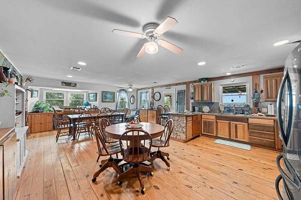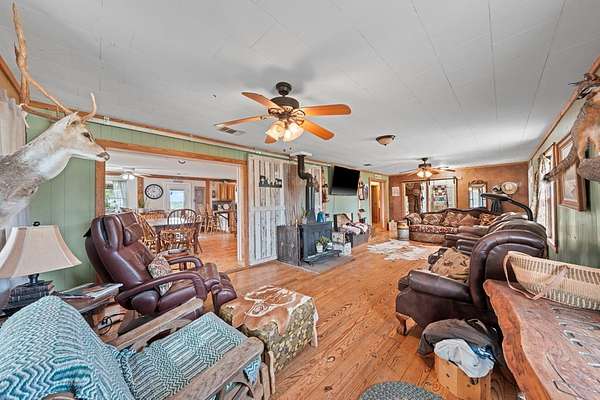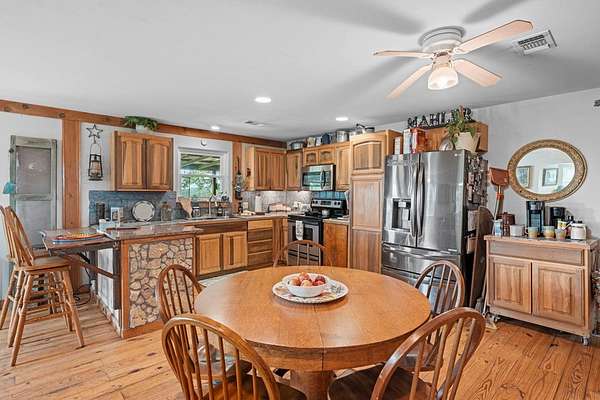 Welcome home to 943 Stoneleigh Road in Center Point, Texas, your very own piece of Hill Country heaven. Wake up to the sun rising over nearly 16 unrestricted acres of rolling Texas land surrounded by mature oak trees. The main three-bedroom, two-bath home offers hardwood floors, a durable metal roof, and a cozy living room centered around a wood-burning stove. Step onto the covered back porch for morning coffee or unwind on the patio while enjoying views of your private mini-orchard with plum, peach, and apricot trees. Entertain outdoors with a dedicated grill and dining area, then relax under the stars in the hot tub. Guests will appreciate the separate mother-in-law suite with kitchenette and full bath. With a private water well, two large storage tanks, and a fully insulated pump house, this property is built for self-sufficient country living. Abundant wildlife, two seasonal ponds, hunting opportunities, and unforgettable Hill Country sunrises and sunsets complete this rare offering. This isn't just a home it's the lifestyle you've been waiting for.