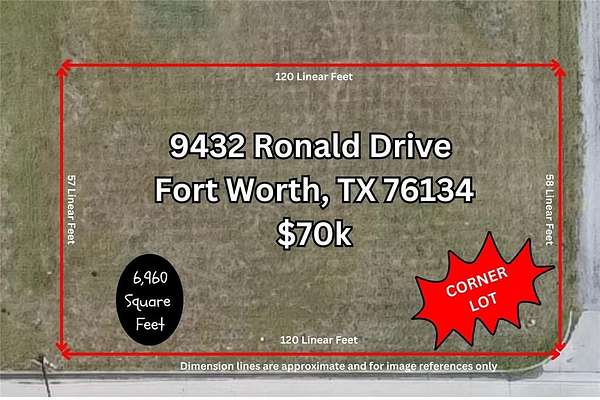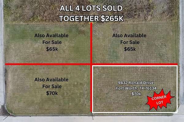 Est $573/moRare Investment Opportunity in Crowley, TX! Located at 9432 Ronald Dr, this prime corner lot is being sold along with 3 adjoining lots for a total package price of $265,000. Situated in a fast-growing area, this combined property offers excellent potential for residential development, a multi-home build, or a future investment hold (buyer to verify zoning and use). With plenty of space and street frontage, it's perfect for builders, investors, or anyone looking to capitalize on Crowley's expansion. Don't miss this unique opportunity!