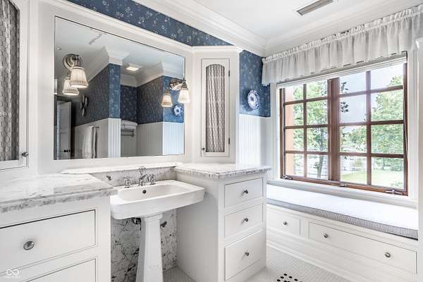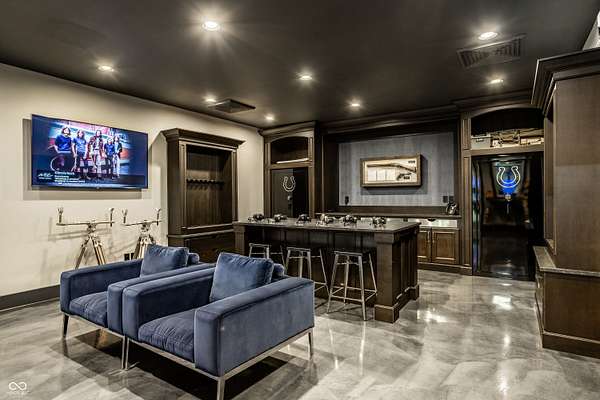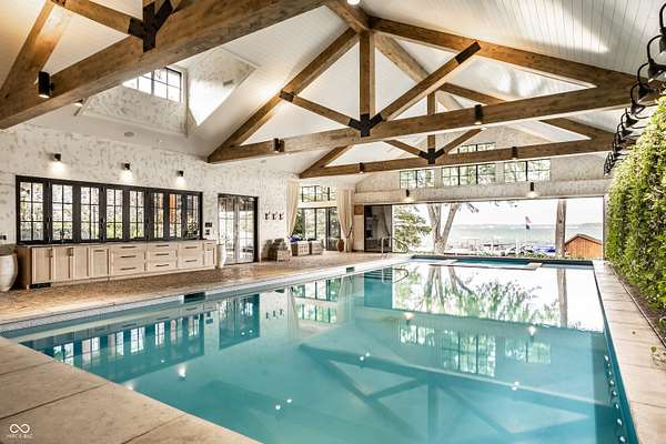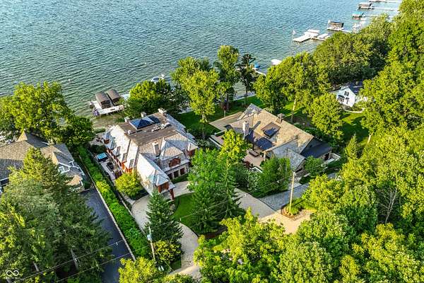 This exceptional Indiana estate at Lake Maxinkuckee offers timeless architectural elegance with lifestyle amenities across two connected parcels. Totaling over 35,000 finished square feet across multiple custom structures with 250 feet of lake frontage, and the largest private dock on the lake (4,000 square feet), this property boasts entertaining, wellness, and recreation spaces. The European-inspired main residence features nearly 14,000 square feet of elegant living space with timber-framed ceilings, hand-painted details, and abundant windows with expansive lake views. There are 8 bedrooms, 10 full plus 2 half bathrooms, and 4 fireplaces across 4 levels (with partial elevator access), including the rare walkout lower level. The home balances grand entertaining spaces with intimate screened sleeping porches and private quarters, creating a true retreat for family and friends. The adjacent indoor pool house provides year-round swimming and has motorized retractable lake-facing doors for true indoor/outdoor living, plus a hot tub, heated paver pool deck, fireplace lounge area, live plant wall, steam room, and fitness areas. The charming 3-bedroom, 2.5-bath guest house offers comfortable, private accommodations. The 8-car garage is ideal for vehicle storage, toys and recreational equipment. Extensive outdoor living spaces include a firepit, sand volleyball court, dining terrace and expansive patios perfect for relaxing or hosting visitors lakeside. A thoughtfully designed entertainment complex with Creston smart automation includes a professional-grade 4-lane bowling alley, arcade, shooting range, and club-style bar, offering versatile options for leisure and gatherings. A discreet underground tunnel connects the two parcels, housing mechanicals away from the main residence to preserve the peaceful lakefront environment. This rare compound represents the ultimate in Midwest lake living, blending luxury, scale, and lifestyle in an iconic setting.