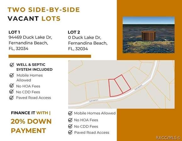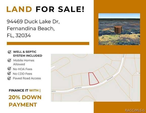 Build or Place your home on this almost Half-acre (0.49+/- acre) vacant lot located at 94469 Duck Lake Dr in Fernandina Beach, Nassau County. This property offers a great opportunity for buyers seeking space, usability, and location, and includes an Existing Well and Septic system, helping to reduce time and upfront costs for future development. Zoning allows for Mobile homes, providing options for site-built, manufactured, or investment use. The property features Paved road frontage, No HOA, and No CDD fees, offering fewer restrictions and lower ongoing costs. The Adjacent lot at 0 Duck Lake Dr (approximately 0.49+/- acres) is also available for purchase, giving buyers the option to own nearly 1 acre of Side-by-Side land for expansion, added privacy, or future plans. Conveniently located approximately 20 minutes to Fernandina Beach and Amelia Island, 25-30 minutes to Jacksonville International Airport, and near Baptist Medical Center Nassau, with close proximity to shopping, dining, and everyday essentials in Yulee and Fernandina Beach. Easy access to US-17, SR-200 (A1A), and I-95 makes commuting simple. This property is ideal for buyers looking to build, invest, or secure land in a growing area of Nassau County with convenient access to major roadways and coastal destinations. Qualified buyers may purchase this property with as little as 20% down payment.