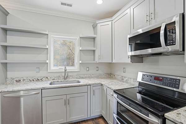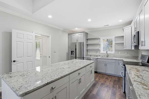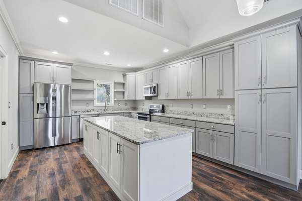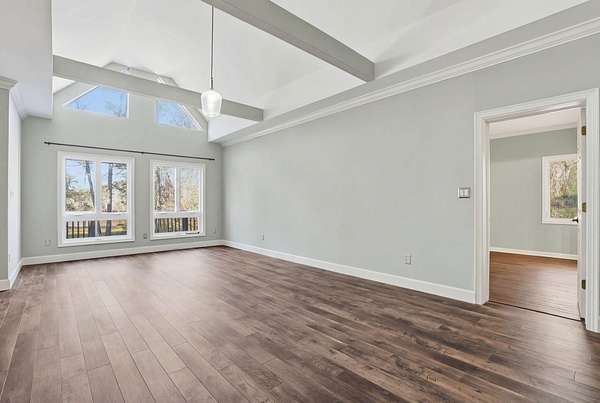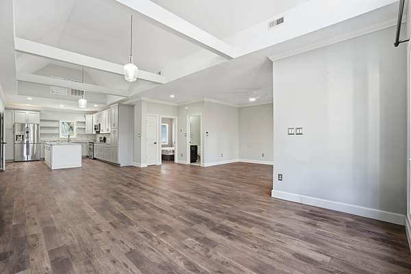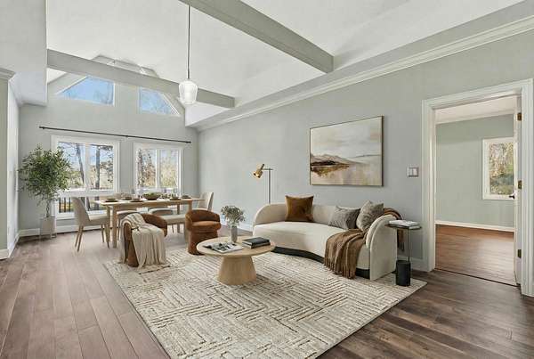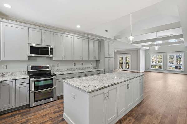 - Beamed Ceilings, Cathedral/Vaulted Ceiling, Ceiling Fan(s), Kitchen Island, Living/Dining Combo, Smooth Ceiling, Walk-In Closet(s)
