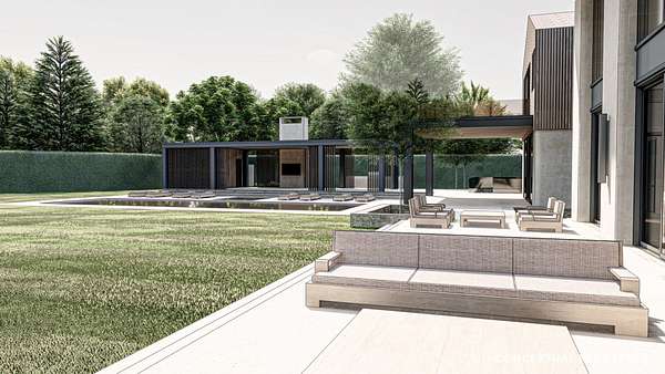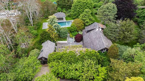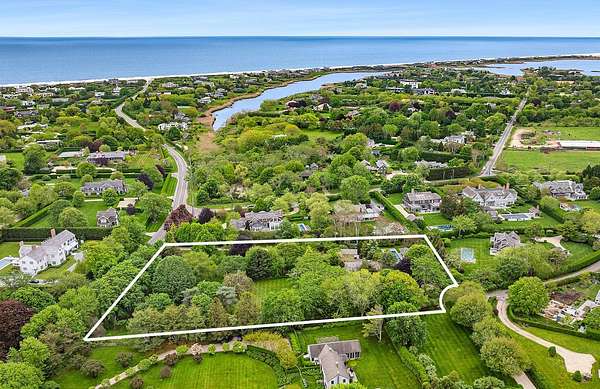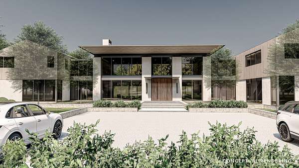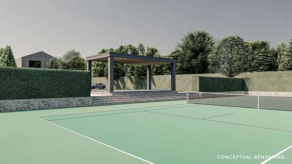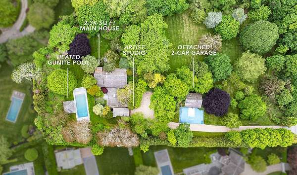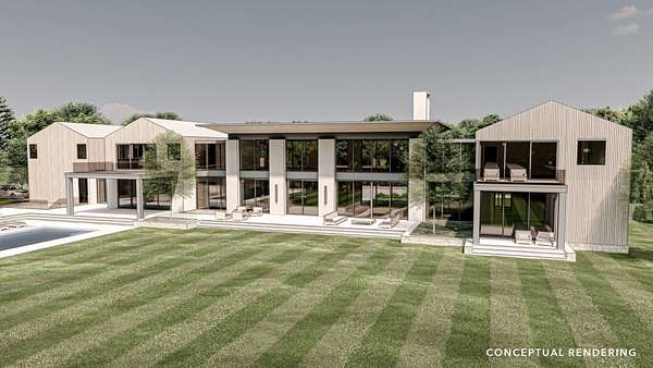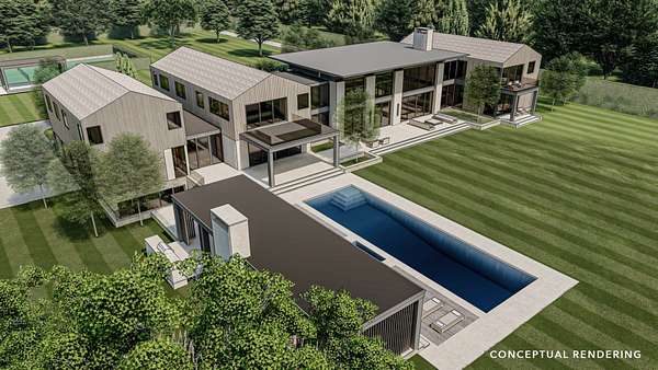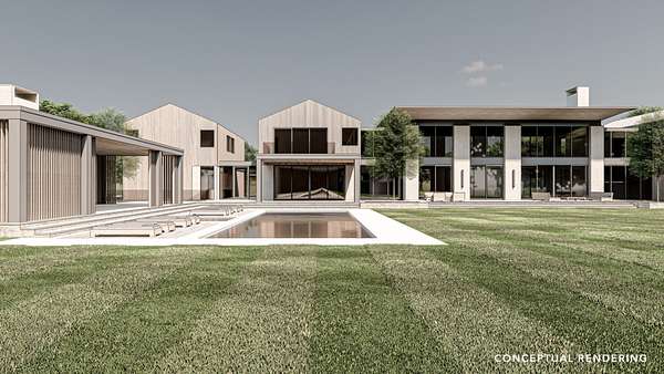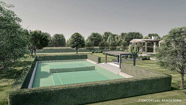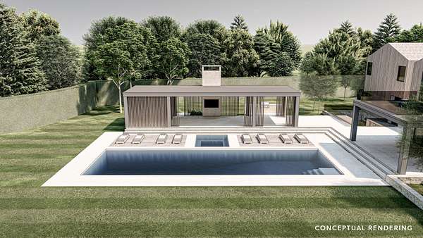 Set on 3 acres and surrounded by mature specimen trees, this property offers both immediate enjoyment and future potential. The existing house spans approximately 2,300 square feet and is accompanied by a separate artist's studio with a full bathroom, a detached garage, heated gunite pool, and a selection of functional outdoor spaces. It is a comfortable, versatile setup ideal for living, working, or weekend retreat. For those seeking to create a larger estate, the property also presents a rare opportunity for new development. Plans by noted Hamptons architect Raymond Renault are already in place for a thoughtfully designed compound. The proposed development includes a 14,512 +/- sq. ft. main residence with a finished lower level, a heated gunite pool and spa, an attached garage, and a sunken, regulation-size tennis court. The design allows for a seamless blend of indoor-outdoor living, with space for an additional accessory structure, all set within a private, resort-style layout. Whether enjoyed as-is or built anew, this property offers a flexible foundation in a peaceful, setting - ready to accommodate a variety of visions.