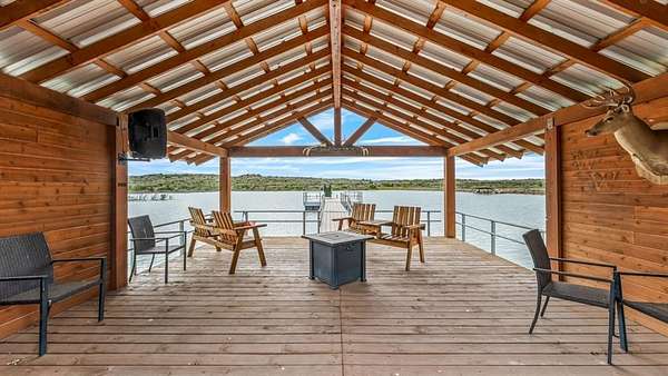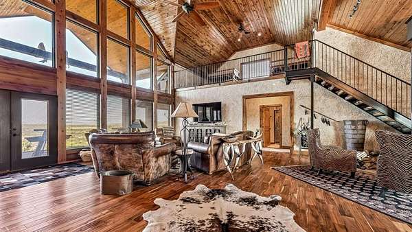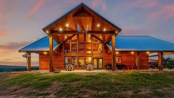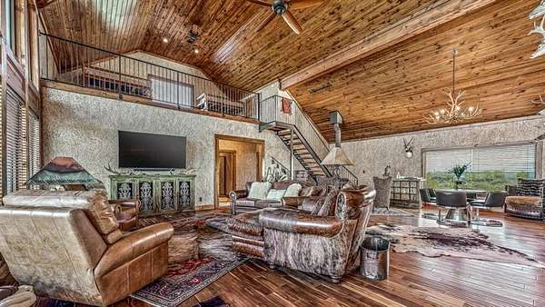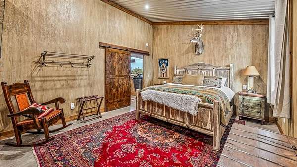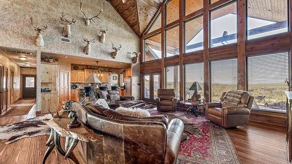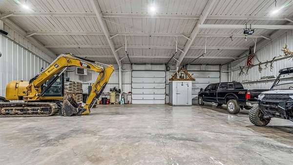 The ranch features a one-of-a-kind 80' x 80' barndominium lodge that serves as both a comfortable retreat and a fully functional headquarters. With 2,000 square feet of living space, this lodge includes a trophy-lined great room, an impressive rock bar with a commercial-grade cooler and ice maker, and two guest suites with private baths. The wrap-around porches and outdoor firepit provide the perfect setting for entertaining or relaxing after a long day outdoors. The adjoining 60' x 80' insulated shop area offers four automatic rollup doors, industrial shelving, and ample storage.