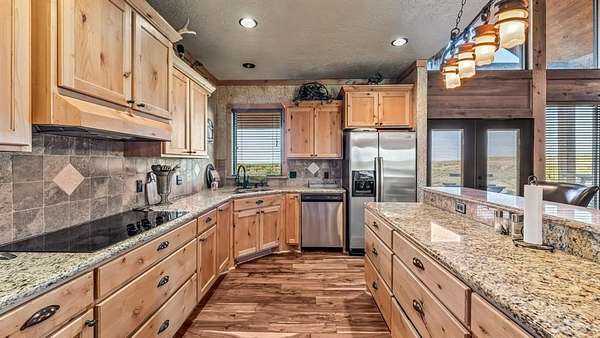 Just west of the lodge, the custom cedar main residence overlooks the scenic Devils Creek canyon. The home features three bedrooms, a loft, three baths, vaulted ceilings, a wood-burning stove, and expansive windows showcasing the landscape. Its open kitchen with granite countertops and premium appliances makes it ideal for entertaining, while covered porches on the east and south sides offer stunning sunrise and sunset views.