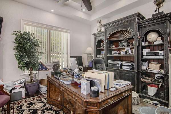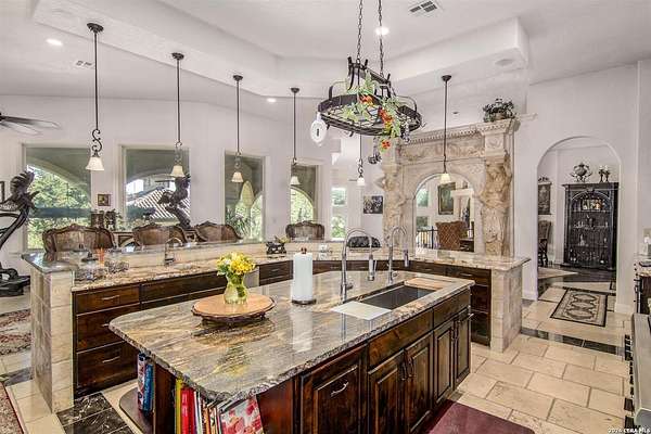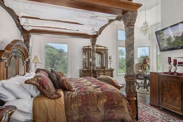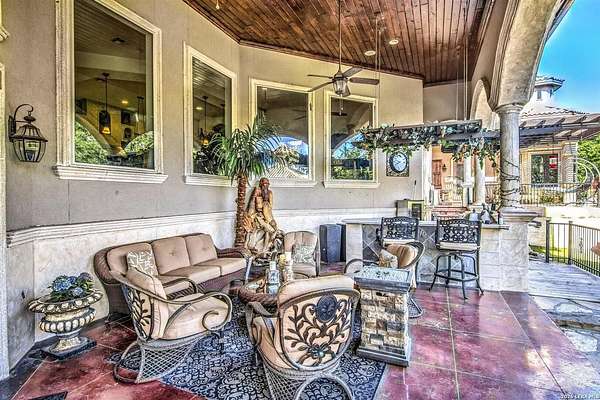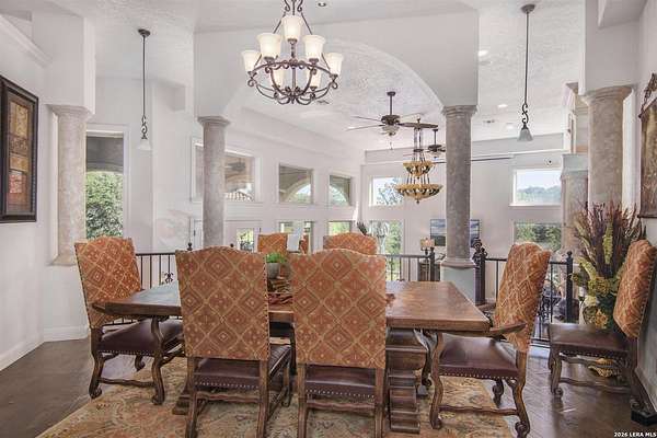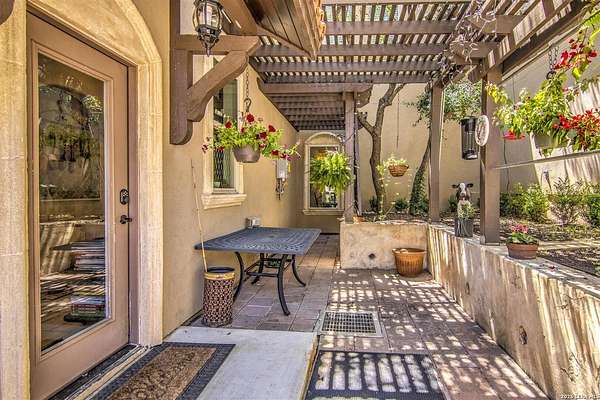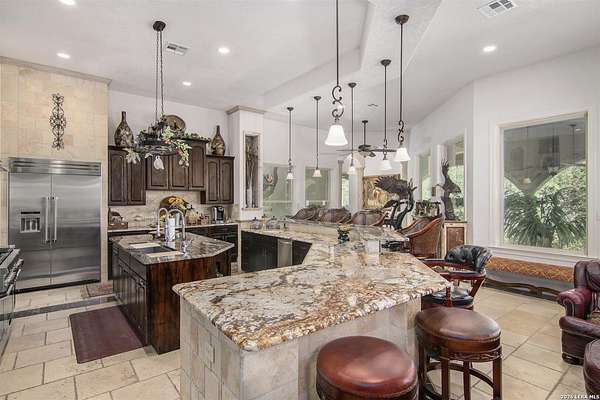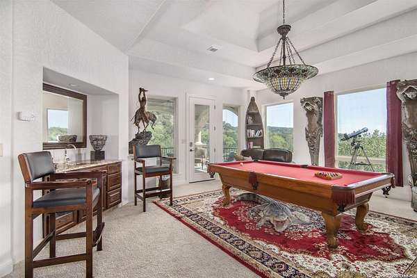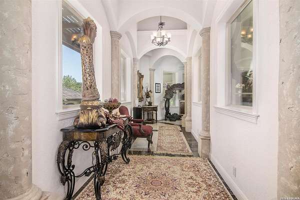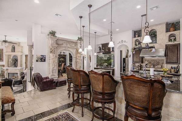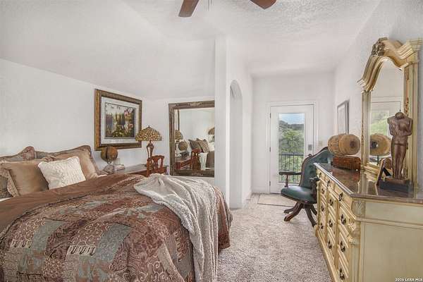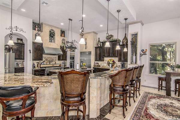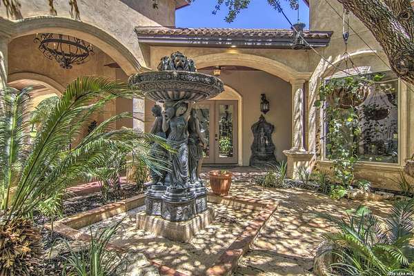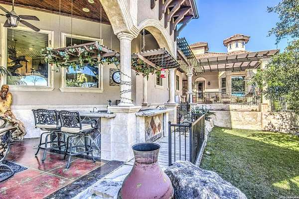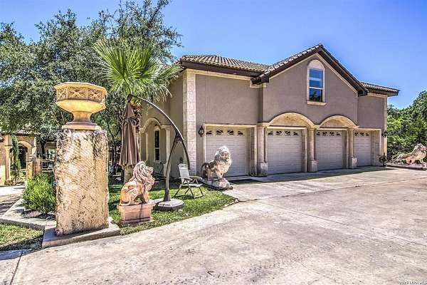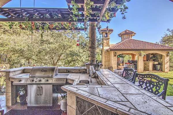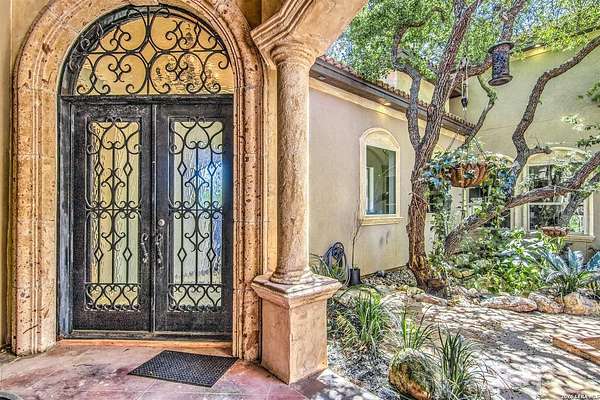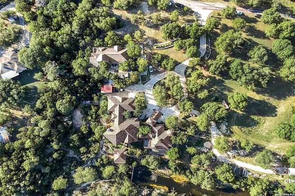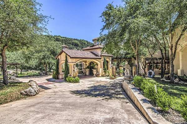 Welcome to an exceptional Hill Country estate nestled on approximately 10 acres in the highly desirable Helotes, offering a rare combination of privacy, natural beauty, and refined living. Set against a breathtaking canyon backdrop, this Mediterranean-inspired residence is surrounded by mature trees and features a spring-fed, year-round LIVE WATER river with a picturesque waterfall, creating a truly serene and park-like setting. Designed with both elegance and functionality in mind, the main residence showcases an open-concept layout filled with natural light, soaring ceilings, and timeless architectural details including arched entryways, crown molding, and high-end finishes throughout. The chef's kitchen is thoughtfully appointed with custom cabinetry, premium appliances, expansive counter space, and a generous walk-in pantry, seamlessly flowing into multiple living and dining areas ideal for both everyday living and entertaining. The primary suite offers a private retreat with tranquil views of the surrounding landscape, complemented by a spa-like bath featuring dual vanities, a soaking tub, and a spacious walk-in shower. Additional bedrooms are well-appointed, with several offering private balcony access to take in the stunning Hill Country scenery. A dedicated study, media room, and flexible living spaces provide versatility for work, relaxation, and gatherings. Outdoor living is equally impressive, with expansive patios, outdoor kitchens, and multiple seating areas designed to maximize the property's natural surroundings. A creekside cabana and wooded trails further enhance the experience, offering peaceful spaces to unwind or entertain. In addition to the main residence, the property includes two separate guest casitas, ideal for extended family, guests, or potential income opportunities. Extensive garage capacity, workshops, and additional structures provide ample space for vehicles, equipment, or business needs. Conveniently located just minutes from Loop 1604, The Shops at La Cantera, and The Rim Shopping Center, this extraordinary property offers the perfect balance of secluded luxury and city accessibility-an unparalleled opportunity to own a private Hill Country sanctuary.