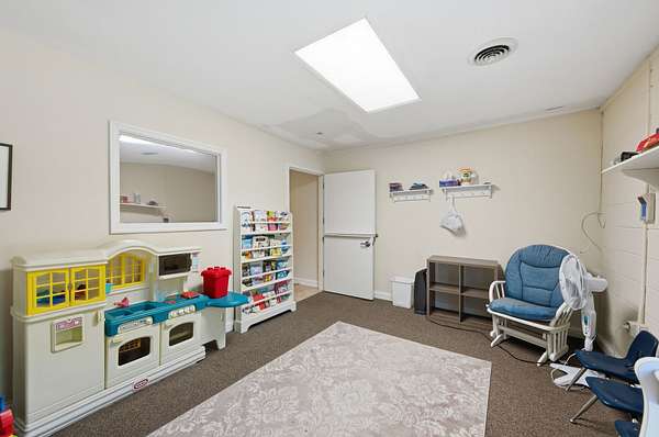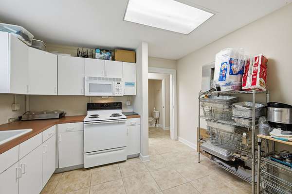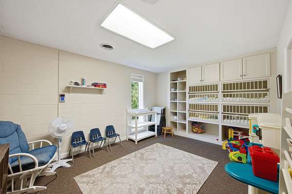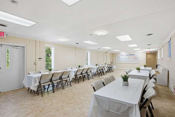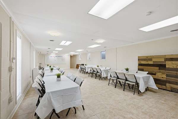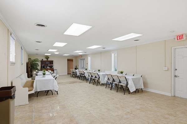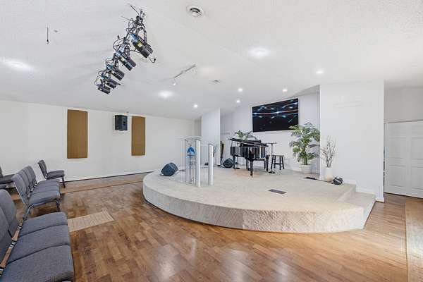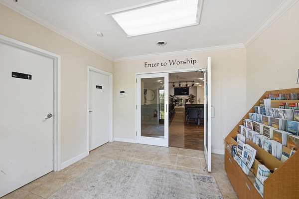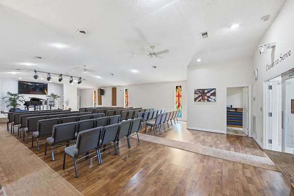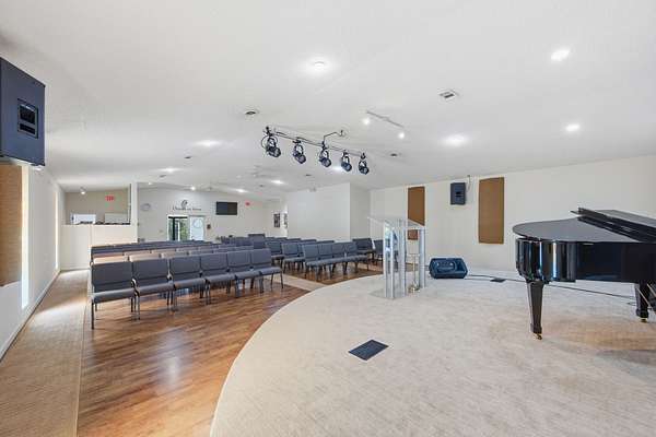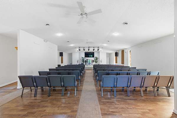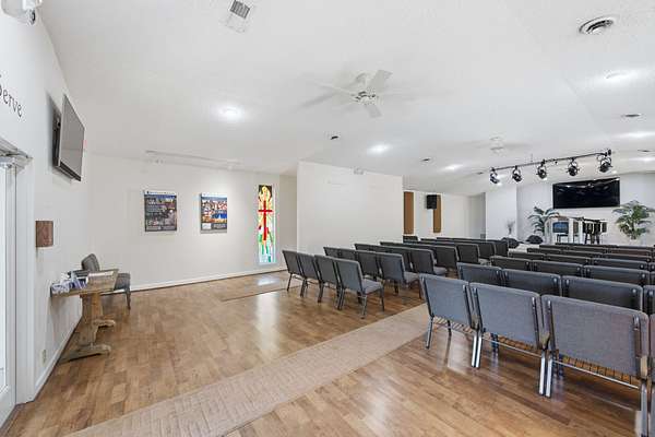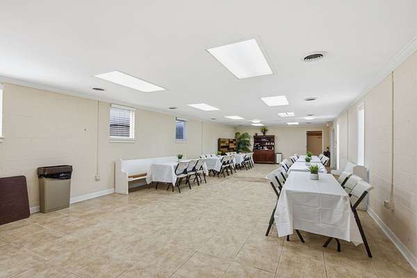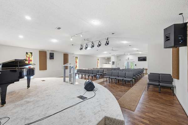 The interior is designed for seamless operation, featuring a sanctuary complemented by four bathrooms (2 Women’s / 2 Men’s), a full kitchen prepared for large-scale hosting, and a private office. A generous flex room adds additional utility, easily serving as a classroom, boardroom, or community space."