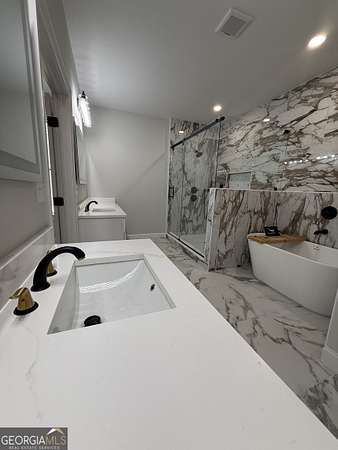 - Double Vanity, High Ceilings, In-Law Floorplan, Master On Main Level, Roommate Plan, Separate Shower, Split Bedroom Plan, Tile Bath, Walk-In Closet(s)