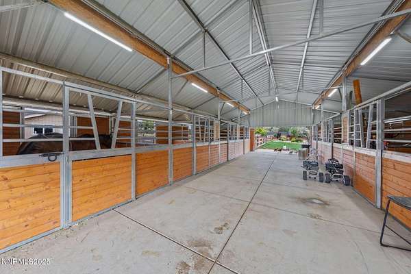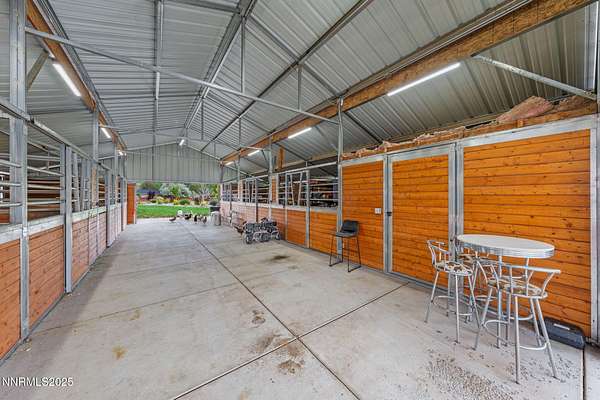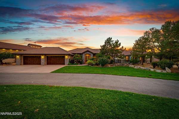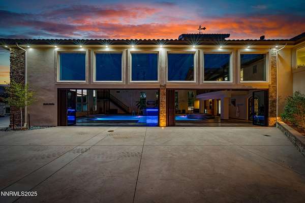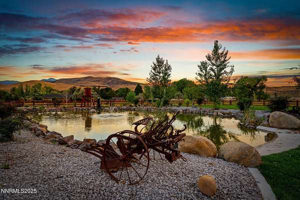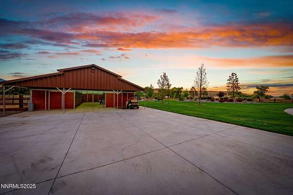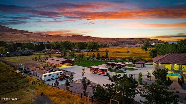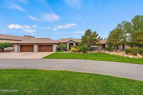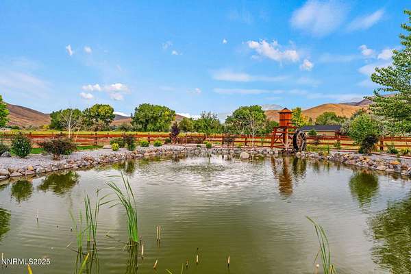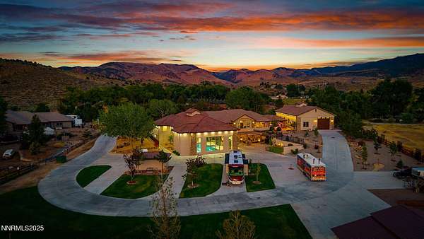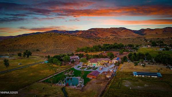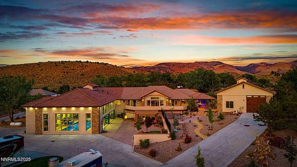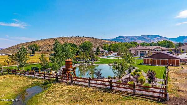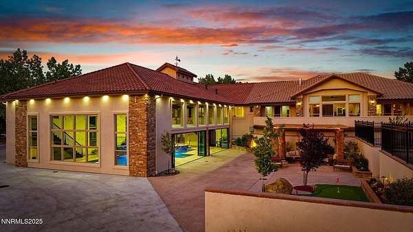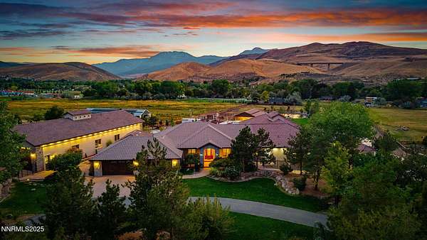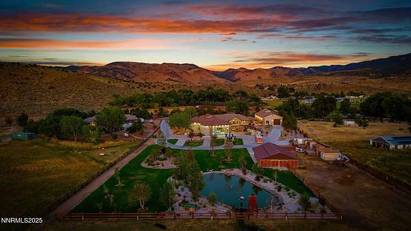 Welcome to a one-of-a-kind Nevada estate where luxury knows no limits and every day feels like a five-star vacation. Just minutes from Reno, Carson City, and Lake Tahoe, this unmatched property blends the serenity of a private ranch with the excitement of a world-class resort-set against a backdrop of Sierra Nevada mountain views and tax-friendly living. At the heart of this retreat is a year-round indoor pool and spa pavilion. Retractable nano doors open the space to a rustic log pergola, fire pit, and private putting green, creating seamless indoor-outdoor living. A fully equipped poolside bar and attached guest suite (complete with sauna) make this space ideal for hosting unforgettable gatherings, all managed from the palm of your hand with smart-home controls. Car enthusiasts and entertainers alike will be captivated by the 4,000 sq ft detached drive-through garage with three 14' doors and 16' ceilings, designed to showcase luxury vehicles, boats, RVs, and the largest toys. This ultimate hangout also features a commercial bar, pool table, shuffleboard, and private guest quarters. This space has been fully automated with surround sound and smart-home technology, perfect for catching the big game or hosting private car shows in your own backyard. In addition to this show-stopping space, the main home also includes a 1,328 sq ft attached garage, bringing the total garage space to an impressive 5,328 sq ft, ample room for every vehicle, toy, and tool imaginable. The outdoor kitchen is a culinary masterpiece, surrounded by glass nano doors and equipped with a pizza oven, smoker, wine fridge, multiple grills, refrigerators, freezer, ice makers, and a custom backlit granite mountain range backsplash. The seamless indoor-outdoor design, paired with infrared heaters and a cozy fireplace, provides year-round comfort and functionality. The main residence features a breathtaking great room with soaring vaulted ceilings, multiple floor-to-ceiling hand-chiseled stone fireplaces, warm hardwood floors, and panoramic views of the Sierra Nevadas. With seven bedrooms-six offering en-suite baths, private fireplaces, and private balconies-every guest enjoys privacy and comfort. The lavish primary suite boasts a balcony overlooking the pool, dual closets (one with a behind-the-mirror hidden safe), and a spa-inspired bathroom. An elevator adds convenient access to all levels of the home for every guest. The fully fenced grounds include irrigated pastures, a breathtaking pond with water wheel, seven-stall equestrian barn with tack room, chicken coop, garden boxes, and four RV hookups with full utilities plus dedicated bathrooms. The park-like landscape lighting, controlled by timers, adds a magical glow throughout the property and an additional 6.5 acre-feet of water rights are included, providing exceptional value and future flexibility for irrigation and property use. This unbeatable location feels like peaceful retreat but is just outside of town. Just 13 minutes to the Reno-Tahoe Airport, 30 minutes to the gorgeous shores of Lake Tahoe, and 21 minutes to the nearest ski resort. Enjoy everything the Sierra Nevada Mountains have to offer with direct ride-out access for horses and off-road adventures, no need to get the trailer, just saddle up and go. This isn't just a home-it's an all-inclusive lifestyle. A sanctuary of recreation, relaxation, and endless possibilities, nestled in one of the most beautiful and accessible regions in the West.