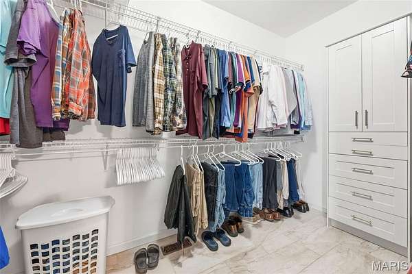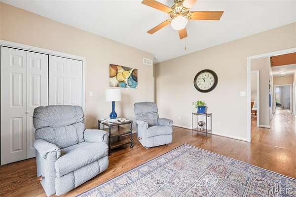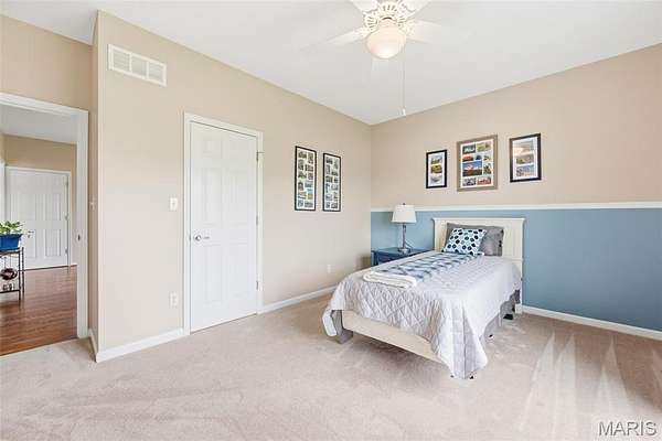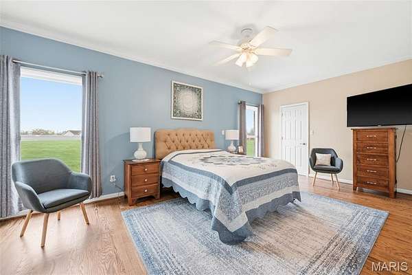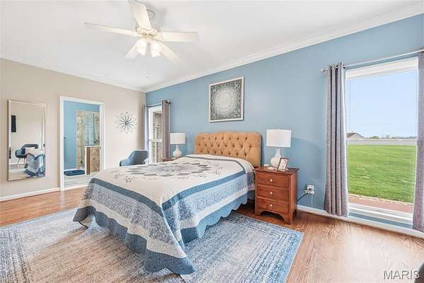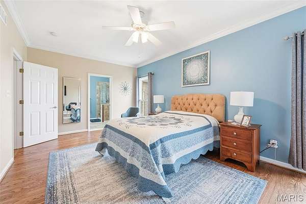 Each bedroom includes a walk-in closet, while the primary suite stands out with crown molding and a refined, comfortable atmosphere. Hardwood flooring flows through the home, adding warmth and durability.