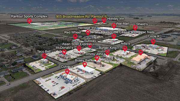 Prime commercial development opportunity located just off I-57 in a high-visibility, high-traffic corridor in Rantoul, IL. This vacant land is strategically positioned in a thriving business area with excellent highway access, making it ideal for retail, hospitality, hotel, restaurant, gas station, or mixed-use development. Walking distance to the Rantoul Sports Complex, a major regional attraction that drives consistent visitor traffic and economic activity to the area-making this site especially attractive for hospitality and retail development. Located within a TIF (Tax Increment Financing) District, offering potential incentives to develop, including possible reimbursement for eligible project costs (buyer to verify with municipality). The property benefits from strong traffic counts, easy ingress/egress, and proximity to major employers, national retailers, and Champaign-Urbana. Utilities are nearby (buyer to verify), and flexible zoning supports a wide range of commercial uses. This is a rare opportunity to acquire well-located development land in a growing corridor with strong upside potential.