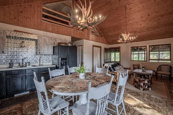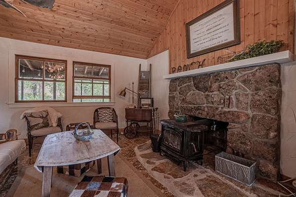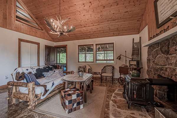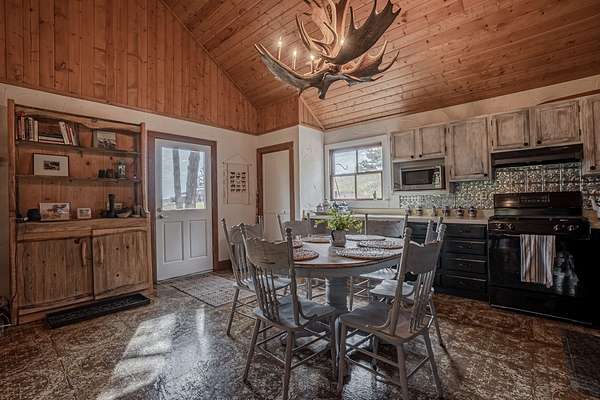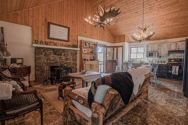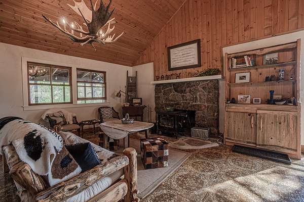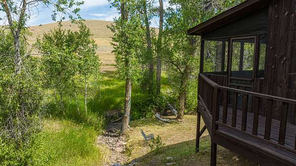 This 3 bedroom cabin sits on 35 acres with Meadow creek meandering right out the front porch. This cabin has been updated and cared for by its owners, the larger open kitchen and living room is highlighted by large moose antler chandeliers and large windows that look out onto the fully screened front porch. Three bedrooms (two large and one small) on the main level and a large loft area make this one of the larger cabins. The cabin is serviced by propane and electric, septic vault and water is delivered by the property’s caretaker into a cistern (water delivery can be delayed by snow/ice on the access road). High Speed internet is available (with use of MiFi or satellite dish).