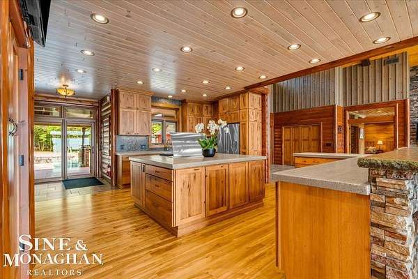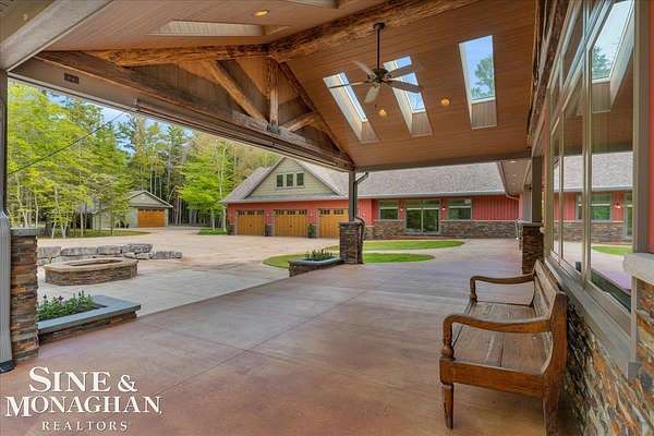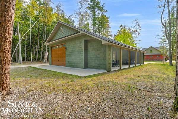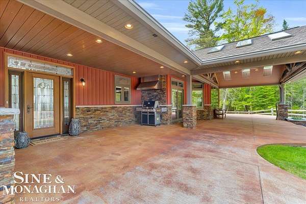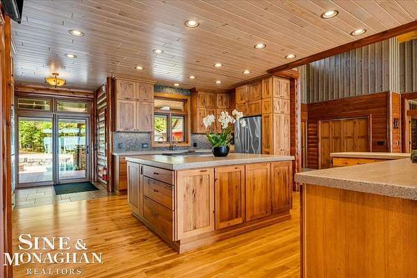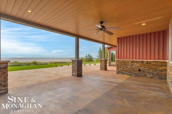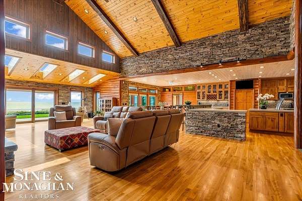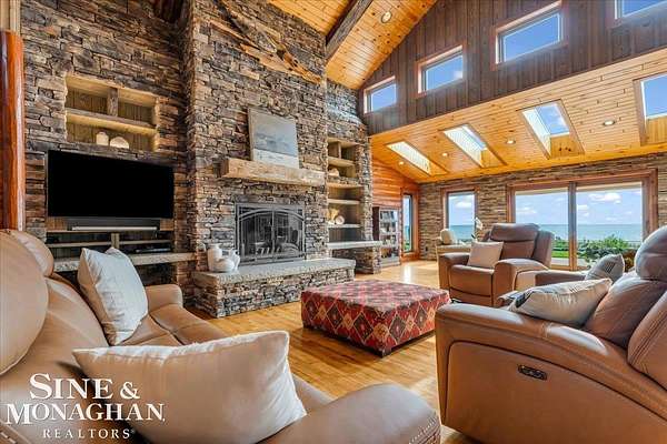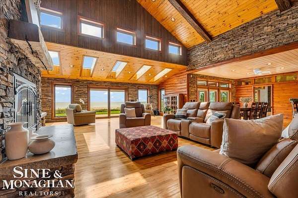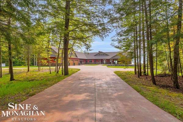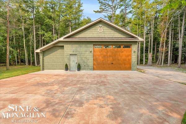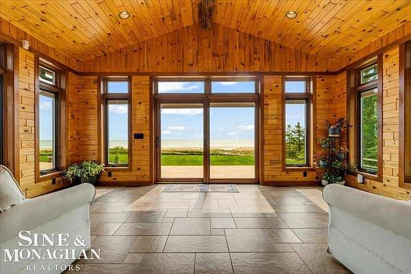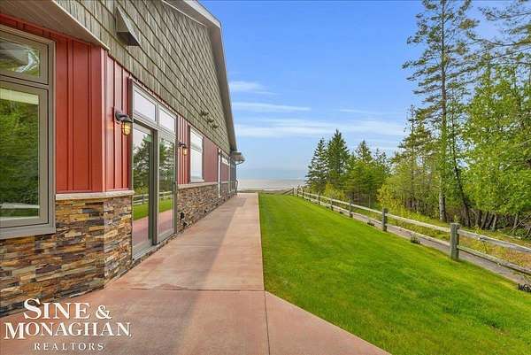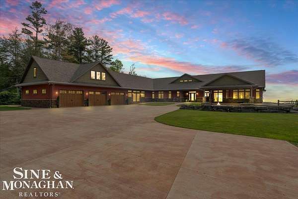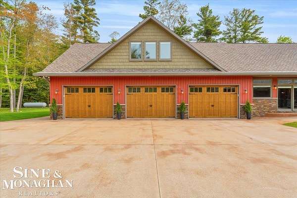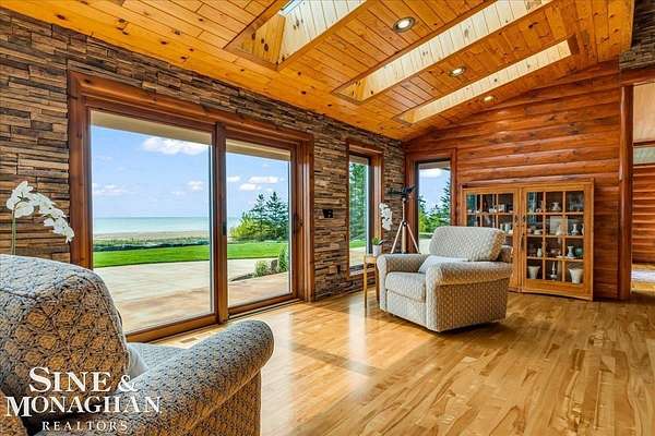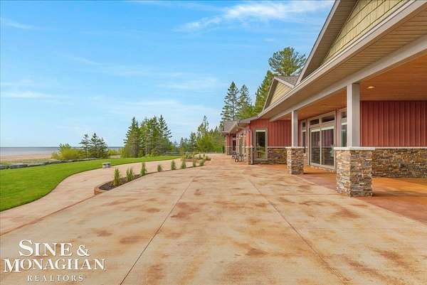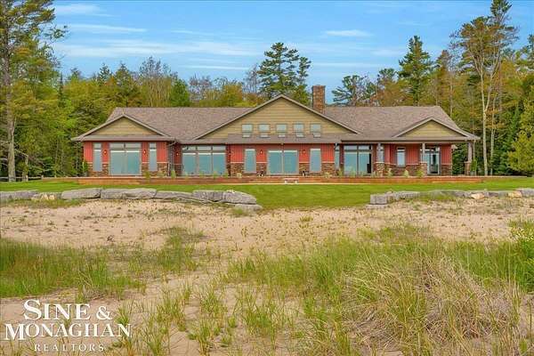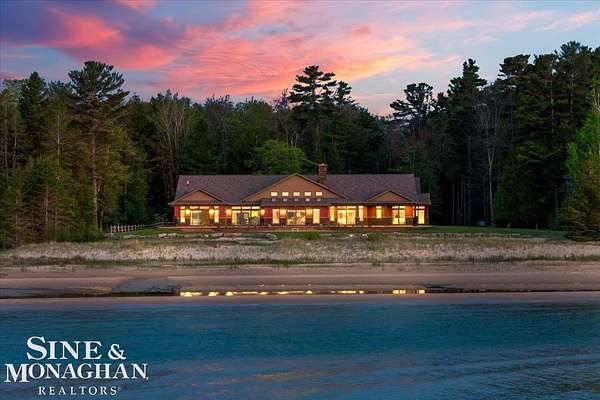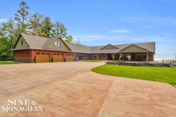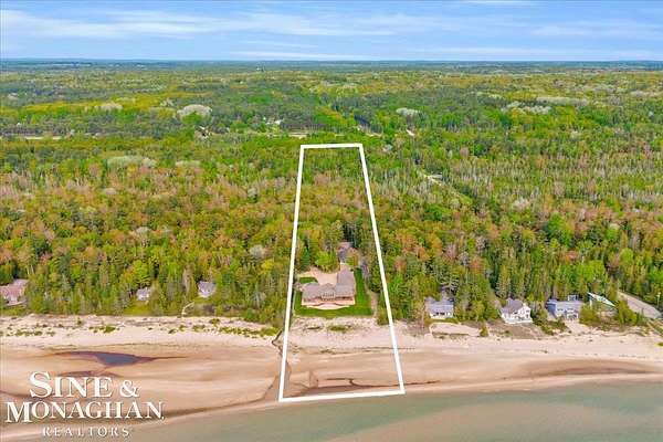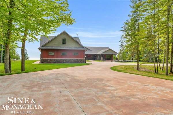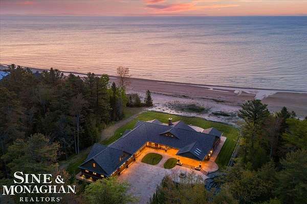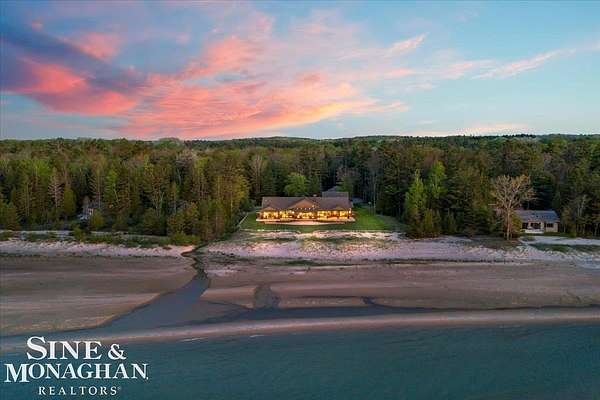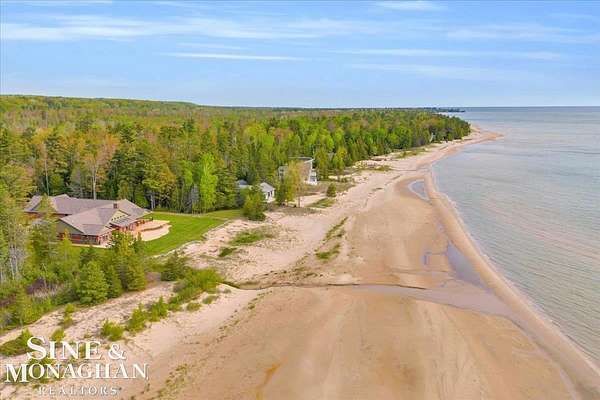 Welcome to 950 N Lake Huron Shores Drive, a rare and extraordinary custom lakefront estate offering 6750 sq. ft. of refined rustic elegance; on 10 wooded acres with 250 feet of private Lake Huron frontage. This 4-bedroom, 4.5-bath ranch home showcases exceptional craftsmanship with reclaimed wood details, birch floors, and Michigan blue pine throughout. Designed for both comfort and sustainability, the home features geothermal heating, an ERV air system, dual septic tanks, and a whole-house Generac generator. The gourmet kitchen is equipped with Bosch and JennAir appliances, hickory cabinets, a cooktop, and beach glass exposed concrete countertops, while natural light floods the open-concept living space through Pella windows, heavy-duty sliders, transoms, and a dramatic 2-story fireplace. The private master wing includes a sunroom, jetted tub, oversized shower with high end plumbing fixtures, and expansive walk-in closet. Additional highlights include a guest wing with mini kitchenette and living area, As well as a completely finished flex space with full bathroom and control room over the garage. Not to mention the upgraded exterior such a custom stained concrete wrap around patios, fire pit, dog wash, outdoor shower, and commercial-grade grill area. A 3.5-car finished garage with workspace, epoxy floors and utility sink. A 30x50 heated & cooled pole barn with additional workshop, bathroom, loft, and lean-to for unlimited storage potential and work space. The beautifully landscaped property features a creek, unparalleled beach access, 650 feet of private trails, and the convenience of biking distance to downtown and the Harrisville Harbor. With smart home technology, remote HVAC and security access, expansive sandy beachfront, and panoramic lake views from every room, this energy-efficient home redefines luxury waterfront living in Northern Michigan.