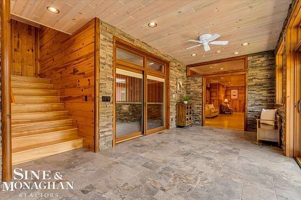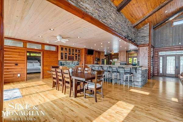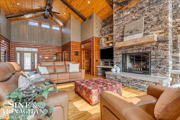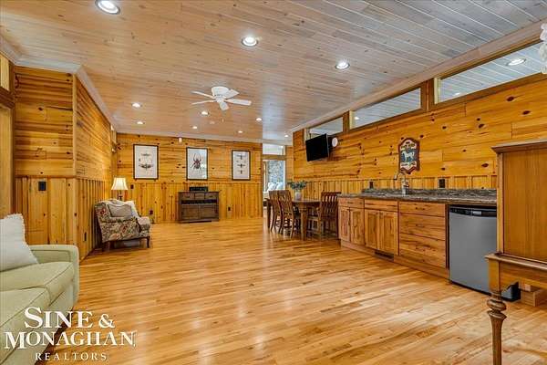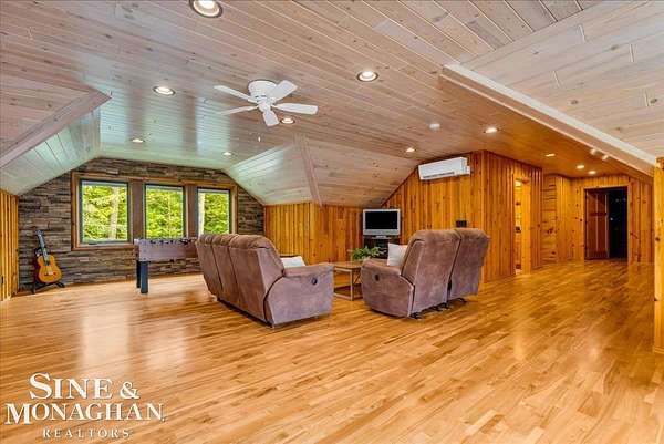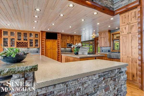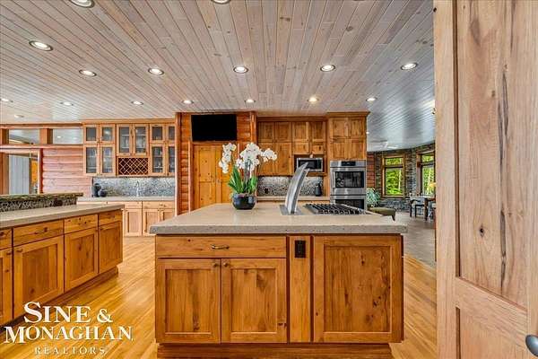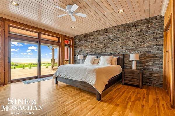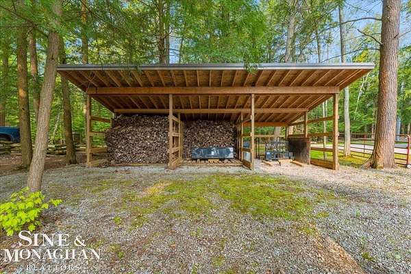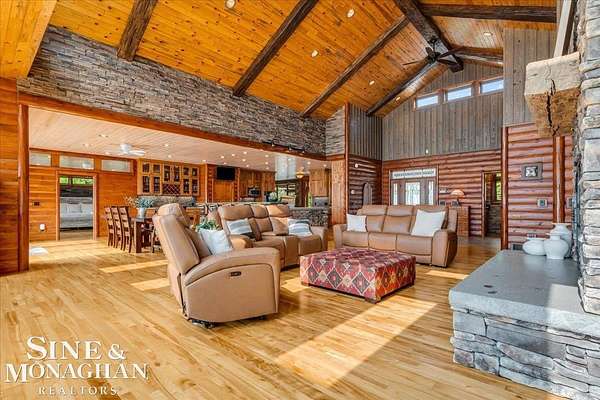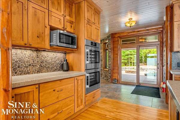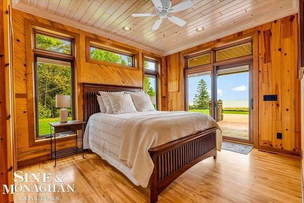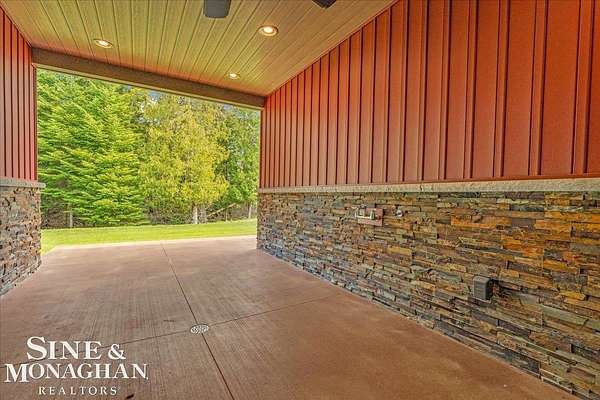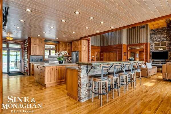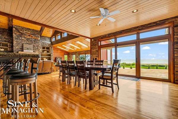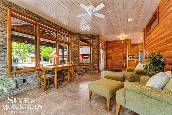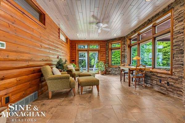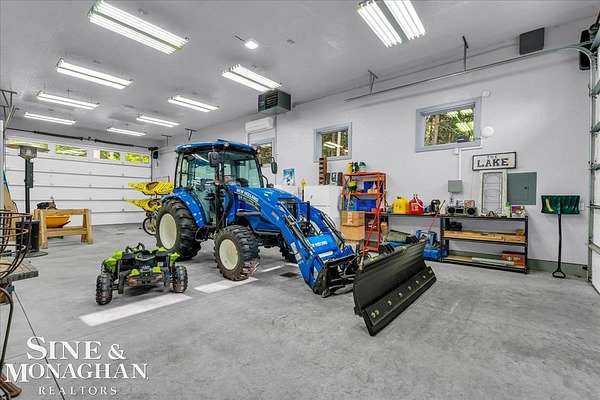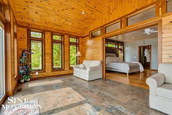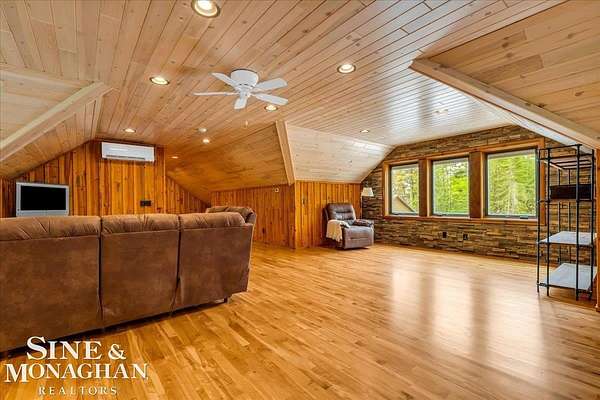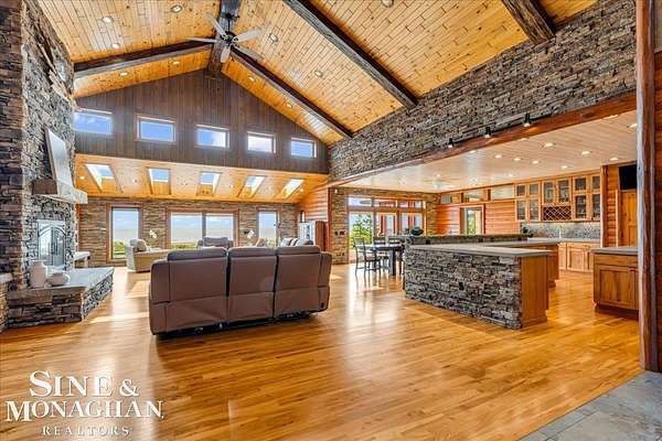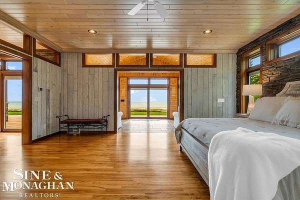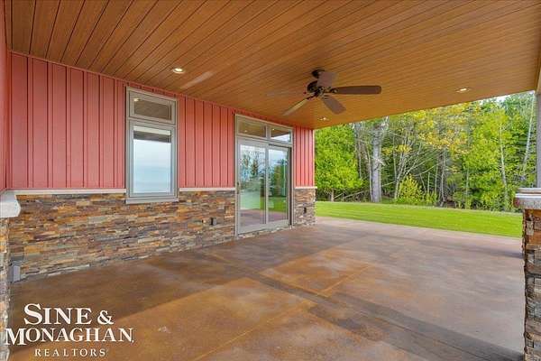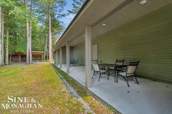 Welcome to 950 N Lake Huron Shores Drive, a rare and extraordinary custom lakefront estate offering 6750 sq. ft. of refined rustic elegance; on 10 wooded acres with 250 feet of private Lake Huron frontage. This 4-bedroom, 4.5-bath ranch home showcases exceptional craftsmanship with reclaimed wood details, birch floors, and Michigan blue pine throughout. Designed for both comfort and sustainability, the home features geothermal heating, an ERV air system, dual septic tanks, and a whole-house Generac generator. The gourmet kitchen is equipped with Bosch and JennAir appliances, hickory cabinets, a cooktop, and beach glass exposed concrete countertops, while natural light floods the open-concept living space through Pella windows, heavy-duty sliders, transoms, and a dramatic 2-story fireplace. The private master wing includes a sunroom, jetted tub, oversized shower with high end plumbing fixtures, and expansive walk-in closet. Additional highlights include a guest wing with mini kitchenette and living area, As well as a completely finished flex space with full bathroom and control room over the garage. Not to mention the upgraded exterior such a custom stained concrete wrap around patios, fire pit, dog wash, outdoor shower, and commercial-grade grill area. A 3.5-car finished garage with workspace, epoxy floors and utility sink. A 30x50 heated & cooled pole barn with additional workshop, bathroom, loft, and lean-to for unlimited storage potential and work space. The beautifully landscaped property features a creek, unparalleled beach access, 650 feet of private trails, and the convenience of biking distance to downtown and the Harrisville Harbor. With smart home technology, remote HVAC and security access, expansive sandy beachfront, and panoramic lake views from every room, this energy-efficient home redefines luxury waterfront living in Northern Michigan.