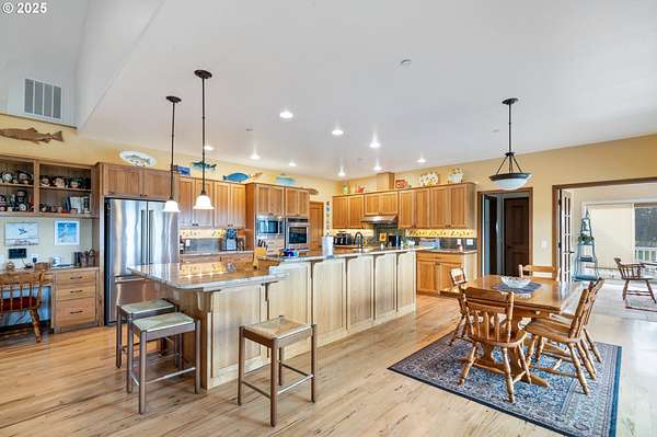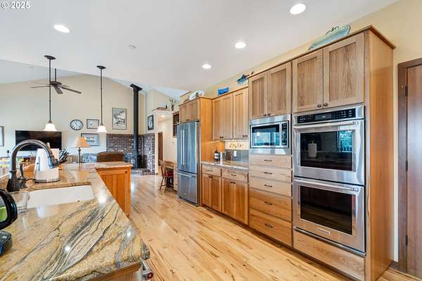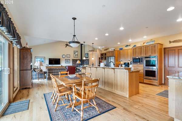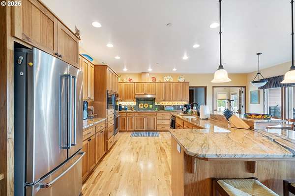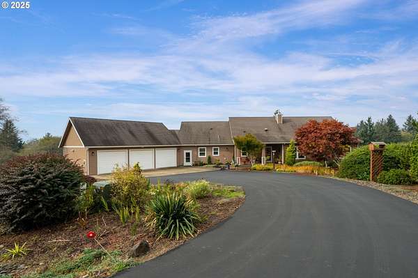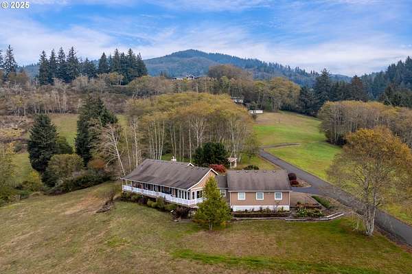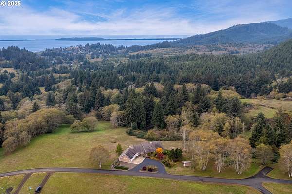 You've found your PEACEFUL, LUXURY RETREAT with expansive Mountain VIEWS and even some Bay and Ocean! Quality constructed with comfort in mind; features include beautiful Hickory floors throughout, contemporary kitchen with huge pantry & breakfast bar, spacious living and family rooms, and wrap-around porch with bright sunroom for gazing upon your 14+ elegant acres. The elk and deer will welcome you. Primary suite offers extra large bath with walk-in shower and TWO separate sink areas and TWO walk-in closets. All this on ONE LEVEL! Oversized, 3-bay garage holds two cars, a 20ft boat, plus extra storage in the loft above. Acreage has ample room for your development dreams. Located in a private neighborhood nestled in the hills of Bay City, this one-of-a-kind treasure is built for impressing - and de-stressing!