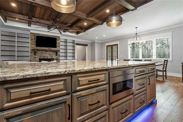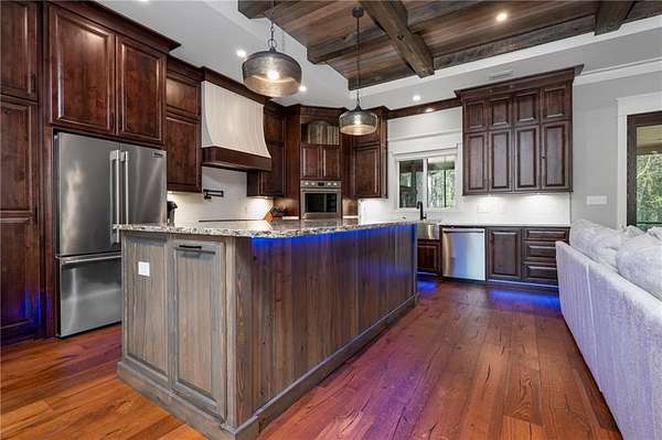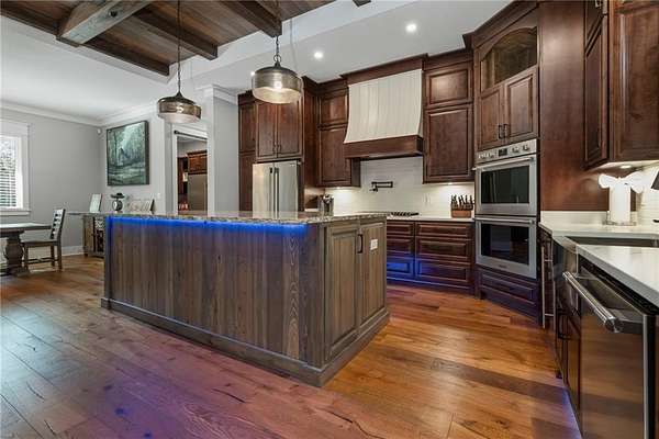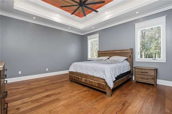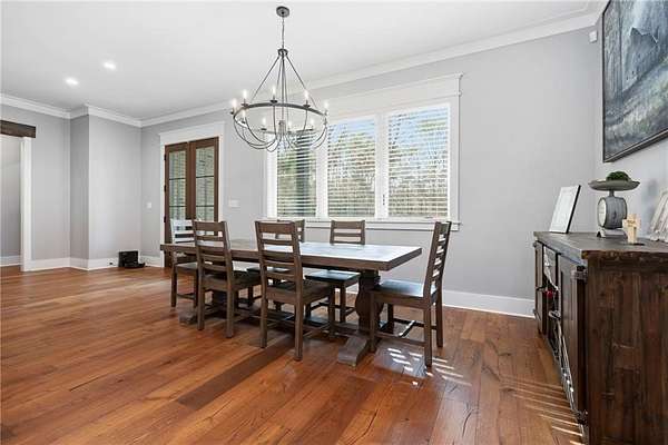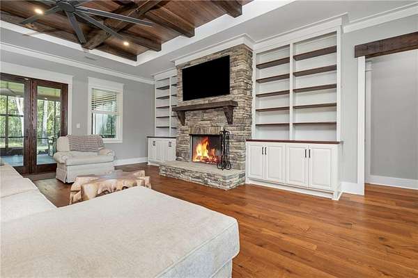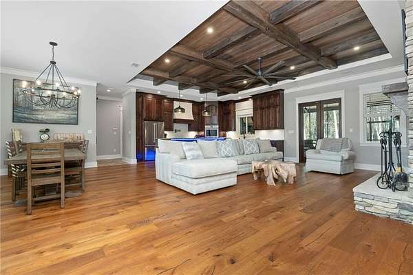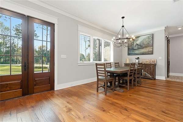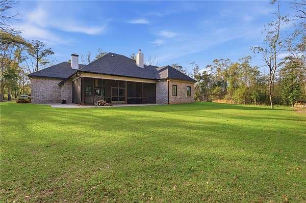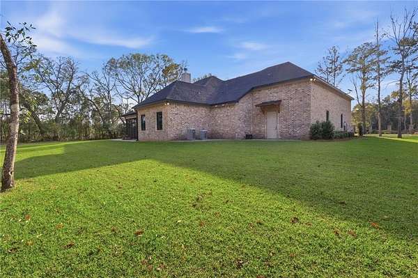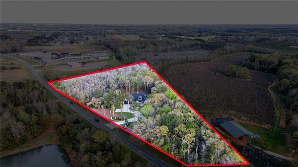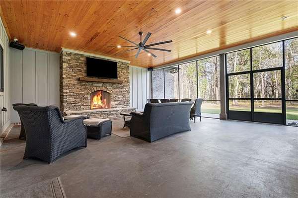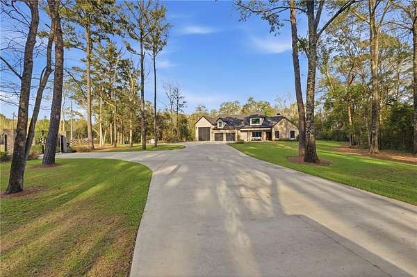 Welcome to 9501 Ben Hamilton Road! A spectacular GOLD-FORTIFIED custom-built home completed in 2023, nestled on 5.5 beautiful acres with a mix of cleared land and wooded privacy, offering an exceptional blend of luxury, comfort, and nature. The main home features 4,557 sq. ft. of heated and cooled living space, with an additional 1,786 sq. ft. heated and cooled garage, creating an incredible amount of functional space for everyday living, storage, hobbies, and entertaining. Designed with both comfort and style in mind, the main level features an open-concept layout connecting the kitchen, living, and dining areas. The chef's kitchen is beautifully appointed with quartz countertops, double ovens, a five-burner gas cooktop, stainless farmhouse sink, drawer microwave, and a spacious walk-in pantry with its own freezer. The family room is anchored by a striking stone wood-burning fireplace with gas starter, framed by custom built-in bookcases. The oversized primary suite is a true retreat, highlighted by a double tray ceiling and a spa-inspired bath with a soaking tub, walk-in shower with multiple shower heads, and a customized walk-in closet. Conveniently tucked nearby for privacy is the well-equipped laundry room featuring Electrolux appliances, cabinetry, and countertop workspace. On the opposite side of the home, two additional bedrooms each offer private en-suite baths and walk-in closets with built-ins. Upstairs, you'll find an oversized rec room, a fourth bedroom currently serving as an exercise room with cushioned flooring, a full bath, dedicated office area, and a walk-up attic providing outstanding storage. The outdoor living spaces are just as impressive. The screened back porch is built for entertaining, featuring a full outdoor kitchen with hibachi grill, Green Egg grill, broiler, wood-burning fireplace with gas starter, and space for TVs. The heated and cooled triple garage includes a third bay with a 14' x 12' door designed to accommodate an RV or boat, plus sewer and power hookups for RV use. Additional features include engineered hardwood flooring and tile throughout, cypress wood accents on tray ceilings in the living room, garage, and back porch, LED lighting in the kitchen and primary suite, three HVAC systems, irrigation system, central shop vac, and a current termite bond that conveys. With GOLD-FORTIFIED construction, new custom craftsmanship, acreage, and high-end details throughout, this is truly a rare find. Listing Broker makes no representation to accuracy of square footage. All updates per the seller(s). Buyer to verify any and all information deemed important for this transaction.