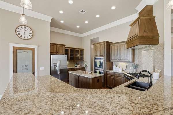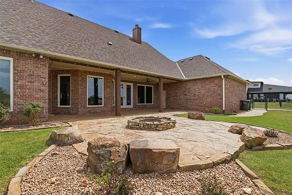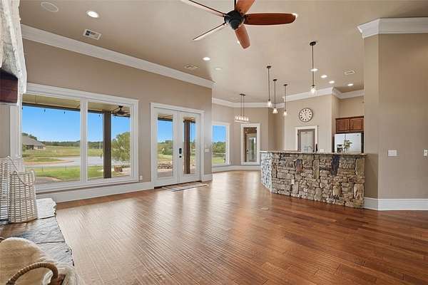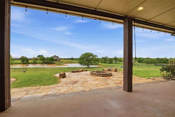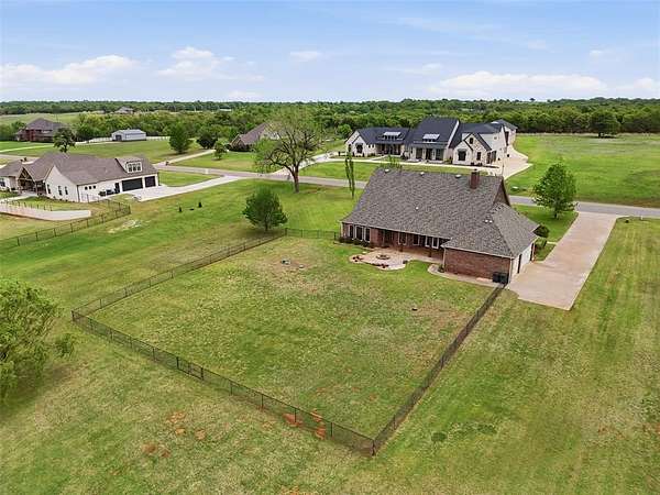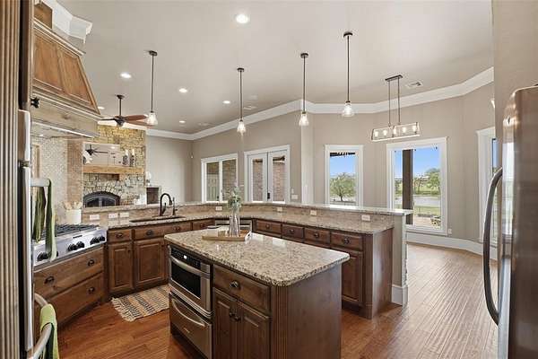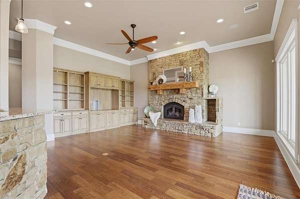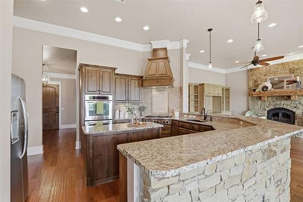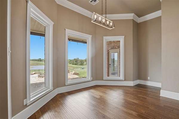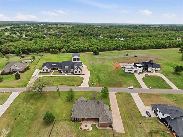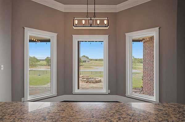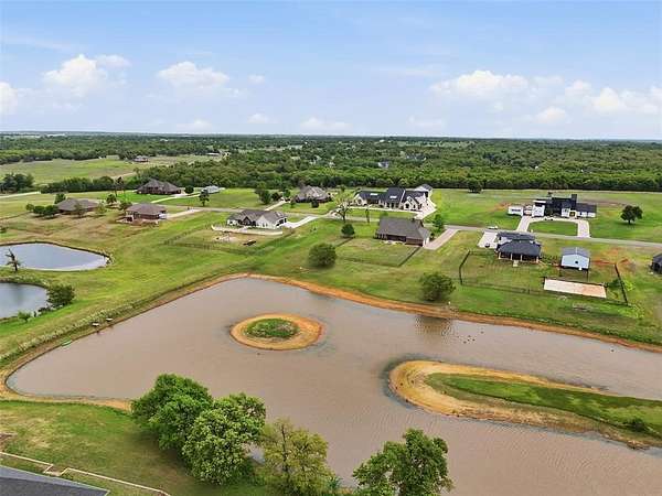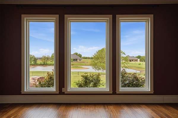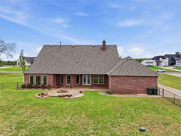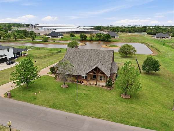 Experience the perfect blend of luxury, space, and peaceful waterfront living on this stunning 2.5-acre property in Guthrie. This 4-bedroom, 3.5-bath home with a dedicated study offers exceptional design, high-end finishes, and breathtaking views of a private stocked pond complete with its own island. Inside, you'll find soaring 12-foot ceilings, rich wood flooring throughout the main living areas, and an impressive floor-to-ceiling stone fireplace with a beautiful wood mantle. The expansive living room is filled with natural light from oversized Andersen windows (with additional UV protection for added energy efficiency) along the entire back of the home, showcasing incredible backyard and water views. The chef's kitchen features a 6-burner gas range, double ovens, warming drawer, under-counter microwave, reverse osmosis faucet, large center island, walk-in pantry, and abundant cabinetry. The dining area is perfectly positioned to take in the scenic surroundings. The primary suite is a private retreat with a tray ceiling, double crown molding, and large windows overlooking the pond. The spa-like ensuite includes a walk-in shower, corner whirlpool tub, dual vanities, and a spacious walk-in closet. Secondary bedrooms are generously sized, including a private in-law suite with its own bath and walk-in closet, plus two additional bedrooms connected by a Jack-and-Jill layout. The study features built-ins and a hidden walk-in room concealed behind a bookshelf. Outdoor living is just as impressive with a covered patio with roller shades, extended stone patio with firepit, and serene water views. Additional features include an oversized 3-car garage with storm shelter, Class 4 impact-resistant roof, two tankless hot water systems, new Andersen windows with transferable warranty, and a 13-zone sprinkler system, and updated septic and well pumps. Welcome Home!