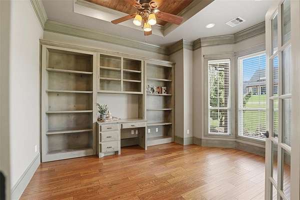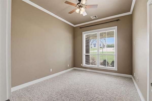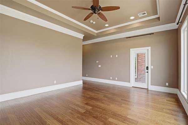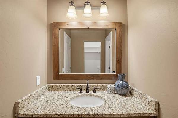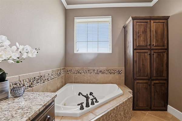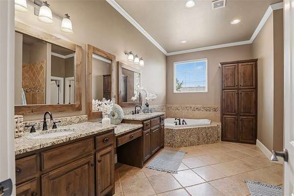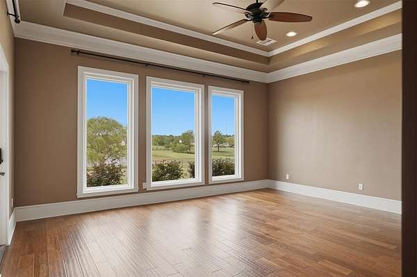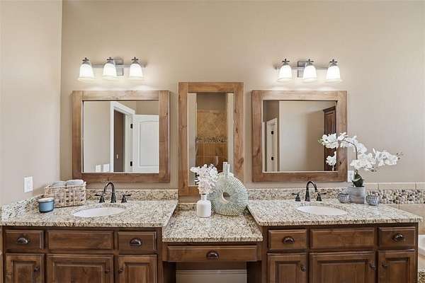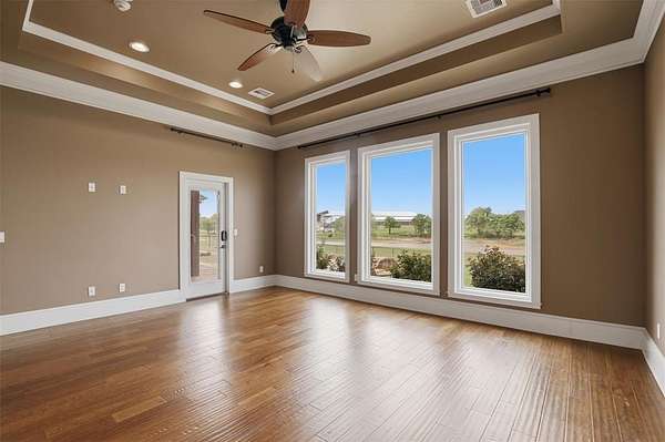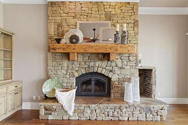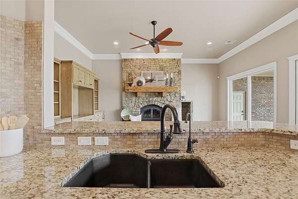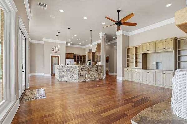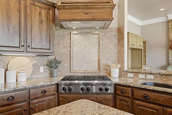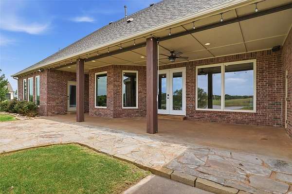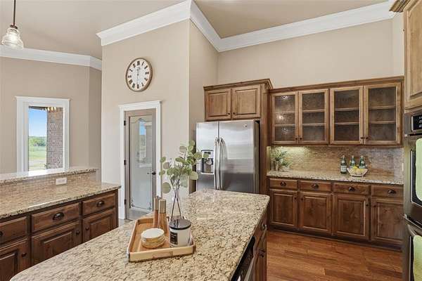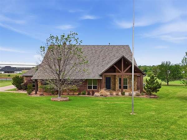 Experience the perfect blend of luxury, space, and peaceful waterfront living on this stunning 2.5-acre property in Guthrie. This 4-bedroom, 3.5-bath home with a dedicated study offers exceptional design, high-end finishes, and breathtaking views of a private stocked pond complete with its own island. Inside, you'll find soaring 12-foot ceilings, rich wood flooring throughout the main living areas, and an impressive floor-to-ceiling stone fireplace with a beautiful wood mantle. The expansive living room is filled with natural light from oversized Andersen windows (with additional UV protection for added energy efficiency) along the entire back of the home, showcasing incredible backyard and water views. The chef's kitchen features a 6-burner gas range, double ovens, warming drawer, under-counter microwave, reverse osmosis faucet, large center island, walk-in pantry, and abundant cabinetry. The dining area is perfectly positioned to take in the scenic surroundings. The primary suite is a private retreat with a tray ceiling, double crown molding, and large windows overlooking the pond. The spa-like ensuite includes a walk-in shower, corner whirlpool tub, dual vanities, and a spacious walk-in closet. Secondary bedrooms are generously sized, including a private in-law suite with its own bath and walk-in closet, plus two additional bedrooms connected by a Jack-and-Jill layout. The study features built-ins and a hidden walk-in room concealed behind a bookshelf. Outdoor living is just as impressive with a covered patio with roller shades, extended stone patio with firepit, and serene water views. Additional features include an oversized 3-car garage with storm shelter, Class 4 impact-resistant roof, two tankless hot water systems, new Andersen windows with transferable warranty, and a 13-zone sprinkler system, and updated septic and well pumps. Welcome Home!