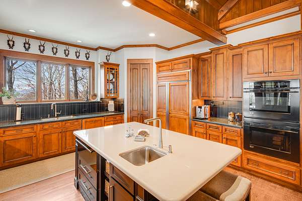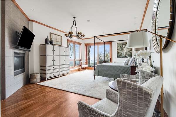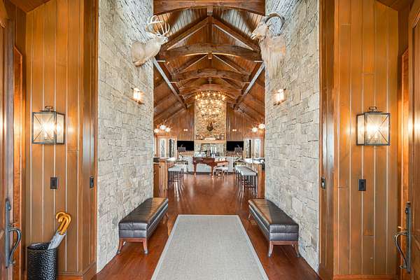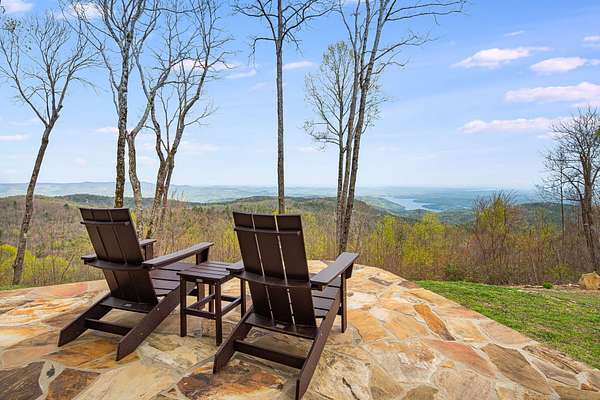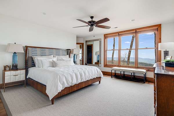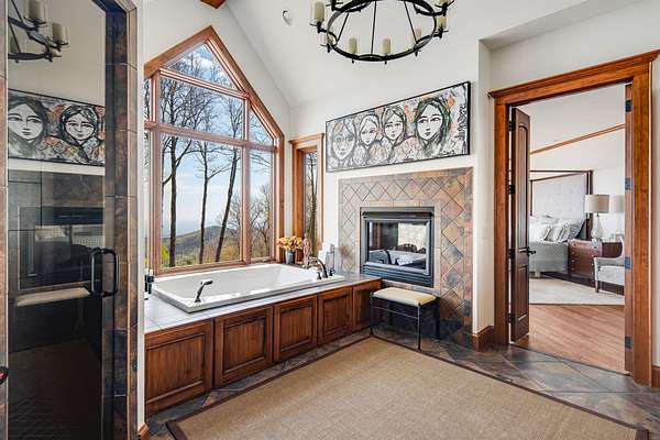 Windy Hill Lodge is an extraordinary mountain retreat set on +/-6.3 private acres at approximately 3,850 feet elevation within a gated community bordered by National Forest on three sides. The property offers sweeping long-range views across North Carolina, South Carolina, and Georgia, including iconic vistas of Whiteside Mountain, Yellow Mountain, Shortoff Mountain, Big Terrapin Mountain, Rabun Bald, and the waters of Lakes Jocassee, Keowee, and Hartwell. Residents also enjoy access to a private 22-acre park with trails and the pristine Whitewater River, creating a rare combination of privacy, natural beauty, and outdoor recreation. This exceptional 5-bedroom, 5 1/2-bath lodge blends refined mountain architecture with timeless craftsmanship and comfort. The expansive great room features a soaring 26-foot cathedral ceiling with exposed beams, rich oak floors, and a massive Tennessee fieldstone fireplace. Windows frame breathtaking mountain views and fill the home with natural light, while the great room opens to a spacious covered porch with its own stone fireplace and outdoor dining area-perfect for enjoying cool mountain evenings and spectacular sunsets. The chef's kitchen is designed for entertaining and everyday living with granite countertops, a large island, butler's pantry, and premium appliances including a six-burner Dacor gas cooktop, GE Monogram built-in refrigerator and freezer, double ovens, warming drawer, and KitchenAid dishwasher. A stand-alone bar with ice maker, sink, and refrigerator provides an inviting gathering space. The main-level primary suite serves as a private retreat with mountain and lake views, a see-through gas fireplace, jetted soaking tub, oversized steam shower, dual water closets, and a spacious dressing room with cedar closet. Also on the main level are a guest bedroom with bath and a paneled library with fireplace. Upstairs offers a private guest suite with bedroom, full bath, sitting area, and wet bar. The lower level includes two guest bedrooms with private baths, an exercise room, craft room, safe room, and a large third garage with workshop area. Additional features include a whole-house generator, central vacuum, four-zone HVAC, emergency water storage, mature landscaping, extensive exterior stonework, and abundant storage. Windy Hill Lodge offers a rare opportunity to experience luxury mountain living in the Blue Ridge Mountains.