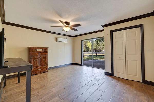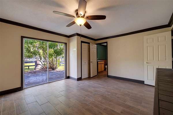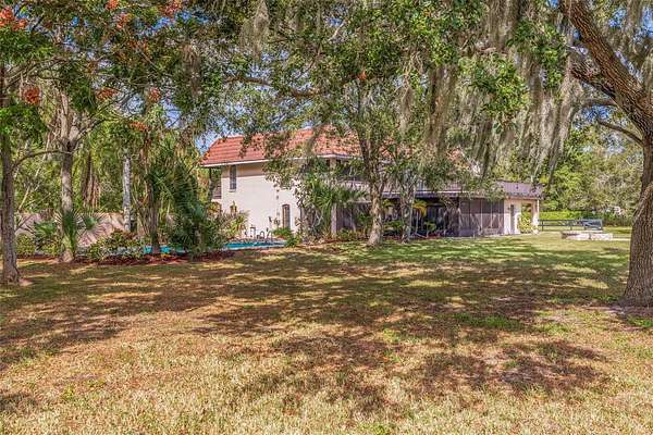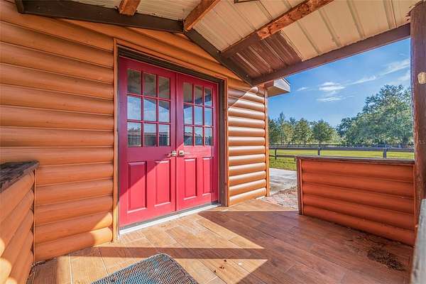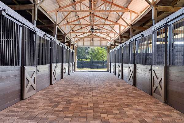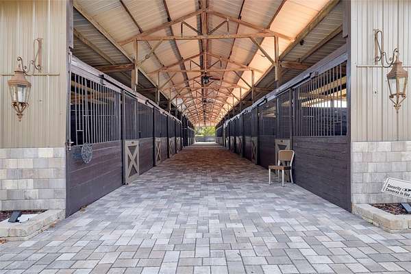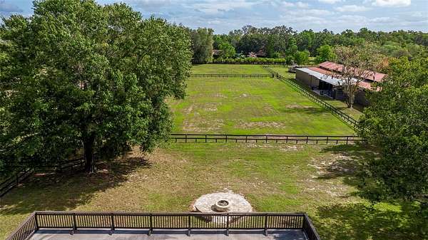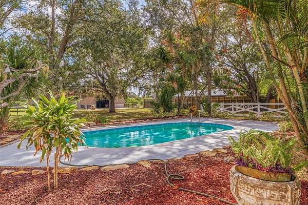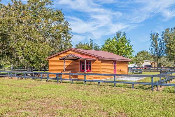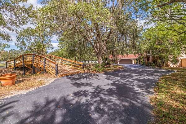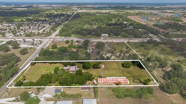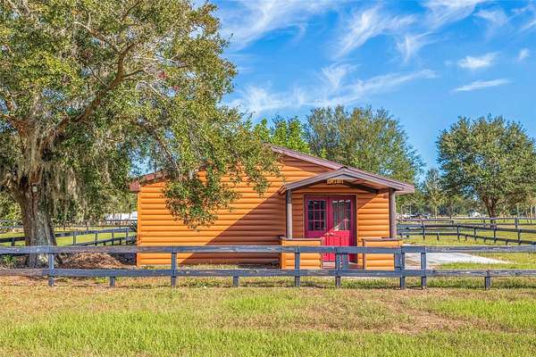 The Skyway Equestrian Center is on the market! This nearly 5 acre horse ranch is located in Palmetto, Florida, and is just waiting for your equestrian needs. The property is 4.9 Acres and is board fenced and cross fenced. The meandering paved driveway leads you around a pond with a footbridge to a 3,967 Sq. Ft. 2 story 5 bedroom, 3 bath, Mediterranean style home with barrel tile roof trin and flat roof and a 3 car attached garage. Home has a large eat-in kitchen and great room with a wood burning fireplace and an impressive entrance foyer. The kitchen has modern appliances, tile and island. Floor coverings are carpet and tile. upstairs are spacious bedrooms and an elevated deck spanning the width of the house. Out back has a big screened in porch overlooking the firepit, paddock, Vinyl clad log cabin guest house and barn. The cabin is 1 Bedroom, 1 bath and great room with modern kitchen. This cabin can be a guest quarters or residence for a farm manager. The crowning touch to this unique property is the 20 stall Horse Barn with tack room, 1/2 bath and water to the stalls. The barn has pavers for the common area floor and the stalls are full sized. The back of the barn leads to a fenced training circle. The location is a short drive to Interstate 275 and is equidistant to Tampa, St. Petersburg and Sarasota-Bradenton. Research indicates that a full service horse stall can rent in this area for $800-$1,000 per month. This is a real winner-You do the math. All sizes are approximate.