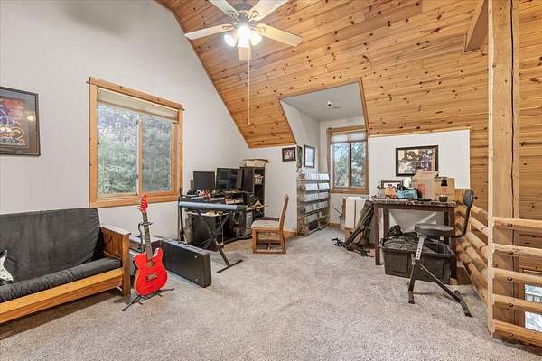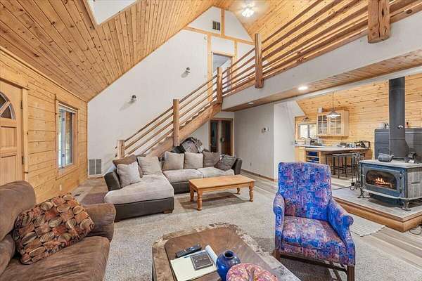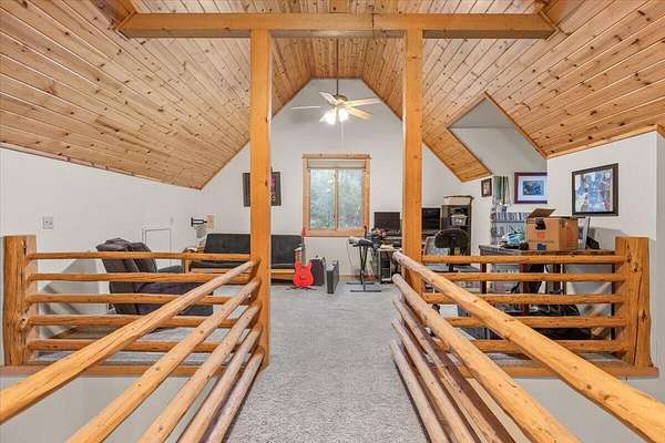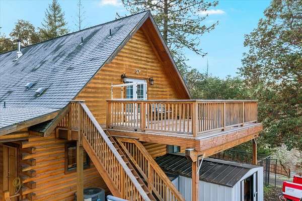 Welcome to 9511 Sterling Creek! A beautifully built log home in the hills above Jacksonville. Set on 23 usable acres and backing directly to BLM land. This home offers space and serenity, with just a 20-minute drive to town. A seasonal creek winds through the property, adding to the peaceful woodland setting. Inside, soaring vaulted ceilings and Canadian white cedar logs create warmth with a refined edge. The primary suite and second bedroom are on the main level, with a third bedroom and spacious loft upstairs, perfect for an office, den, or creative space. Large covered front and back porches invite slow mornings and golden-hour evenings. Major updates include new flooring (2019), upgraded fixtures, new well pump and tank (2015), new deck (2016), 200-amp service to the home, 400-amp service to the detached finished 3-car garage, plus a propane generator for added peace of mind. Private, peaceful, and perfectly tucked into the trees. This is rustic luxury done right!