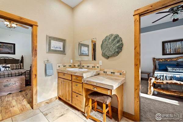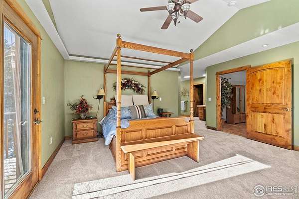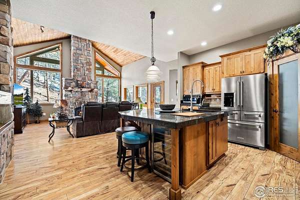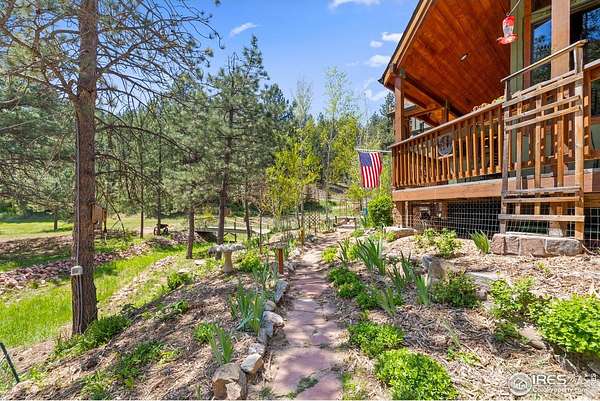 Remarkable custom-built residence nestled on almost 38 acres & within a 450-acre private wildlife conservation easement, offering an extraordinary blend of luxury & natural beauty. The heart of this home features a stunning 2-story great room with a wood stove, adorned with tongue and groove ceiling, creating an impressive architectural statement. The gourmet kitchen showcases high-end appliances & opens to the great room filled with abundant natural light streaming through large windows bringing the forest right into the living room. The spacious primary bedroom suite provides a private balcony retreat, complemented by a luxurious bathroom featuring a walk-in shower, 6-foot soaking tub & water feature. A versatile loft space off the primary bathroom serves perfectly as an office or additional living area. Outdoor living reaches new heights with a wraparound deck, complete with a step-in hot tub surrounded by a serene waterfall & koi pond. There is lovely outdoor space with a separate driveway that can easily accommodate a horse barn, while a charming bridge crosses a seasonal stream, adding to the property's enchanting atmosphere. Additional upgrades include: new boiler heating system, brand new carpet, some new interior paint, a 12 x 16 shed, custom closets, in-floor radiant heat, RV dump station, storage above the garage attic, & an almost 1200sf garage which could fit up to 4 vehicles & all your toys. The home's thoughtful design includes 3 bedrooms, 3 bathrooms, with the option to create a 4th bedroom in the upper floor loft/exercise room. Located near Ramsay-Shockey Open Space & just 20 minutes to the city of Loveland, this property presents possibilities for hosting weddings and events. With only a road association HOA, this sanctuary combines privacy with accessibility, offering a truly distinctive Colorado living experience. Property has been pre-inspected and is in top-notch shape! Recent hail storm in July 2025- Seller will replace roof prior to closing.
