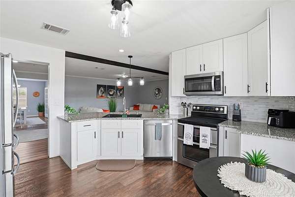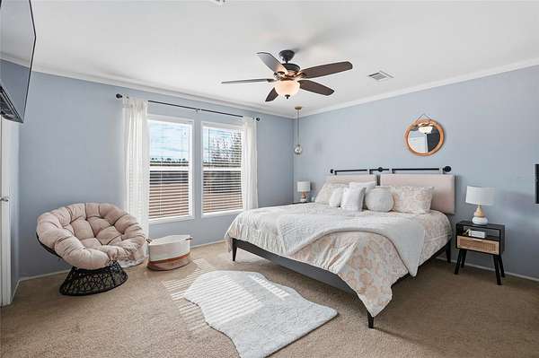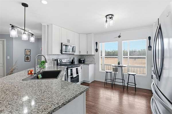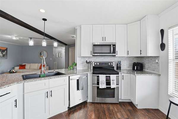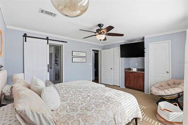Inside, the home features upgraded appliances, solid-surface kitchen countertops, and stylish barn doors. The spacious primary suite boasts a large custom walk-in closet complete with shelving and a center island with drawers, along with an upgraded primary bathroom designed for comfort and relaxation.