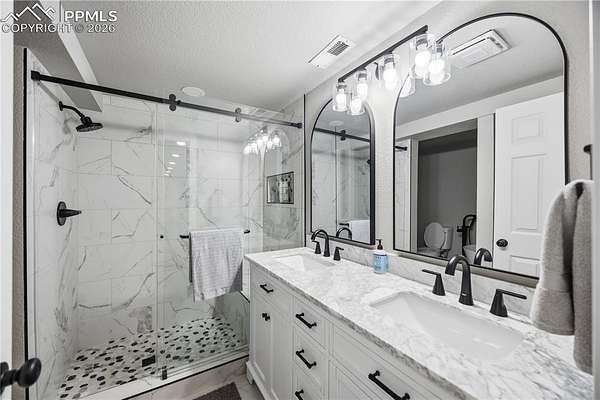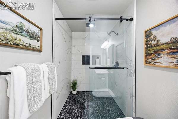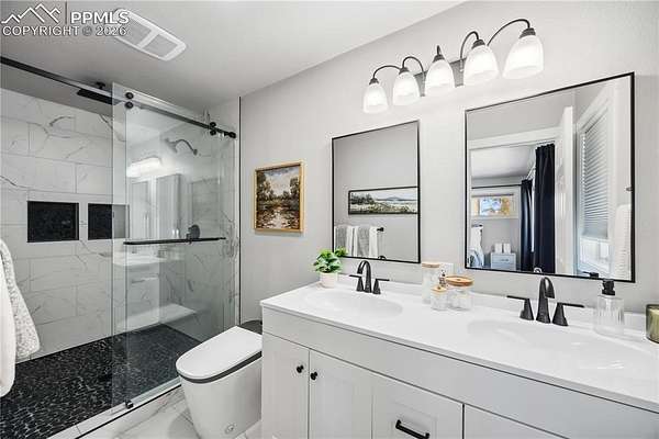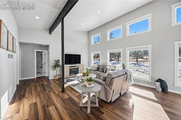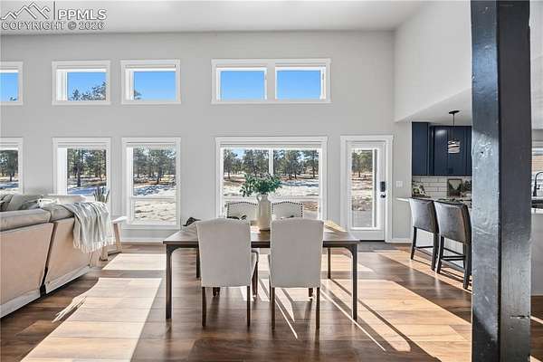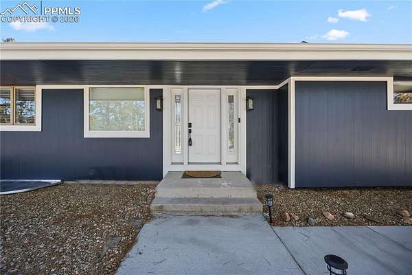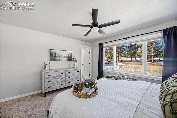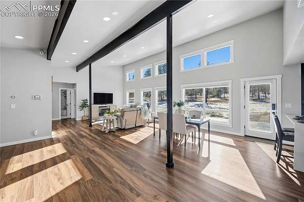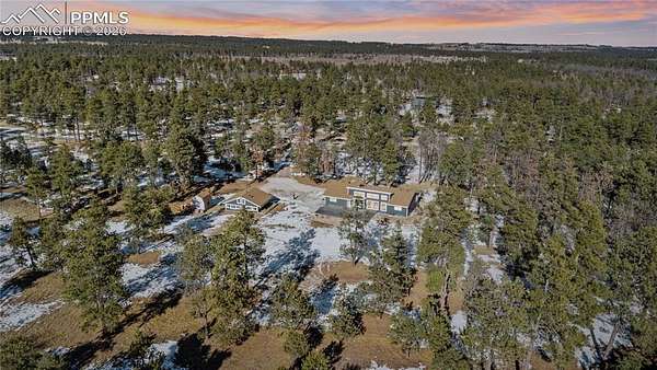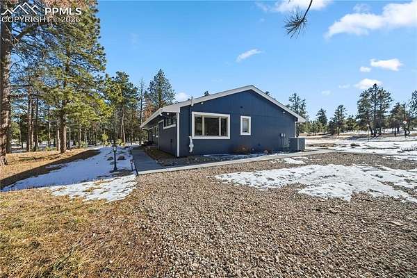 Discover the perfect blend of privacy, space, and convenience in this air-conditioned six-bedroom, four-bath ranch-style home set on five fully fenced, manicured acres with towering old-growth Ponderosa pines in sought-after southern Black Forest. Enjoy peaceful rural living just minutes from schools, shopping, and popular trails at Section 16 and The Pineries, all within award-winning District 20. This home has undergone a comprehensive high-end remodel and major system upgrades, offering true turnkey living. Custom front doors open to a stunning great room with vaulted ceilings, transom windows, and a wall of glass that fills the space with natural light. Fresh interior paint, white window frames, new trim, and modern interior doors with black hardware elevate the home throughout. The fully remodeled kitchen features upgraded appliances, generous counter and cabinet space, a cozy sitting area, main-level laundry, and access to a composite deck ideal for entertaining. The thoughtfully designed floorplan offers exceptional main-level living, with the primary suite privately separated from three additional bedrooms, office, and flex space. The luxury primary bath includes a rain shower with full glass enclosure and coordinated finishes with the guest bath. The finished basement adds two bedrooms, a full bath, family room, kitchenette/bar, and bonus office or craft room with glass French doors. Exterior upgrades include full repaint, stamped concrete patio, new driveway and sidewalks, and an oversized extra-deep detached two-car garage with workshop space. Major improvements include an 80-gallon hybrid water heater, Culligan whole-home water filtration system, advanced security system, remote-controlled blinds, new flooring throughout, and durable cement siding. With no HOA and expired covenants, this serene retreat offers elegant rural living with easy access to Colorado Springs and Denver.