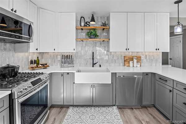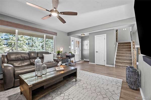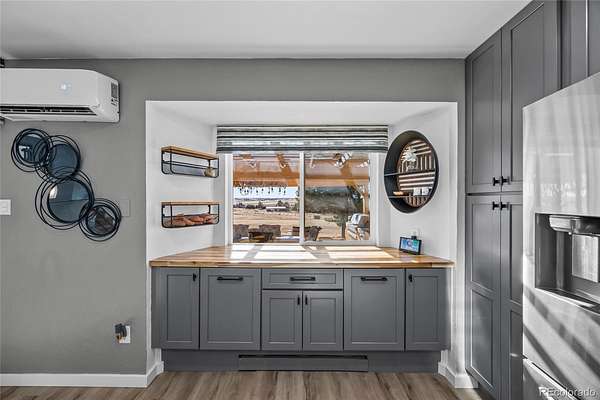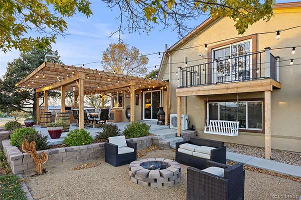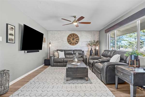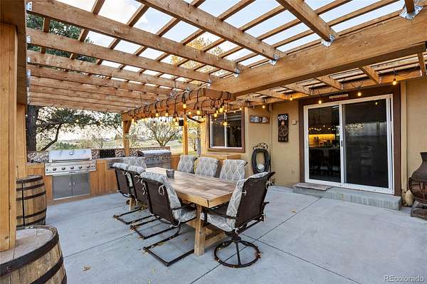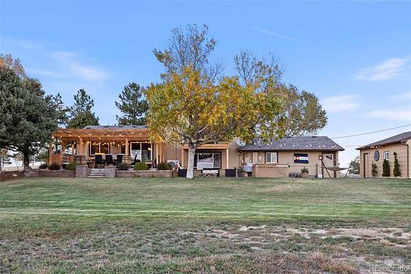 Immaculate, fully remodeled 4-bedroom, 3-bath home on 5 acres just 15 minutes from downtown Parker and Southlands area, offering breathtaking Pikes Peak mountain views!! This turn-key acreage property has been completely updated inside and out. The main level features a bright living room with extended LVP flooring and a stunning remodeled kitchen with quartz countertops, new cabinetry, tile backsplash, pantry with pullouts, butcher block counter with built-in pet feeding station, stainless steel appliances, modern open shelving, breakfast bar, and eat-in dining. Step outside to an expansive outdoor living space with covered pergola and outdoor kitchen, complete with gas plumbed grills and perfect for entertaining.