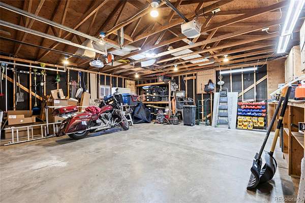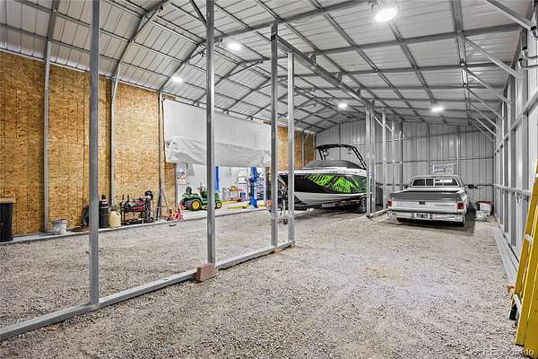 - Concrete, Dry Walled, Gravel, Lighted, Oversized, RV Garage, Smart Garage Door