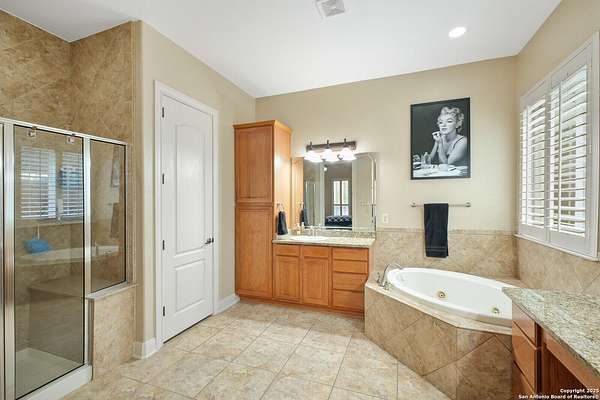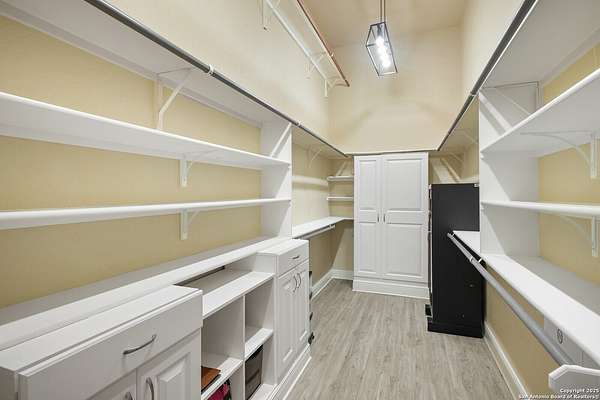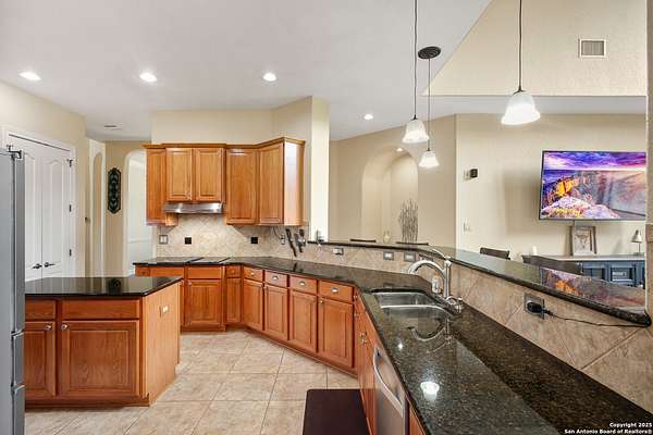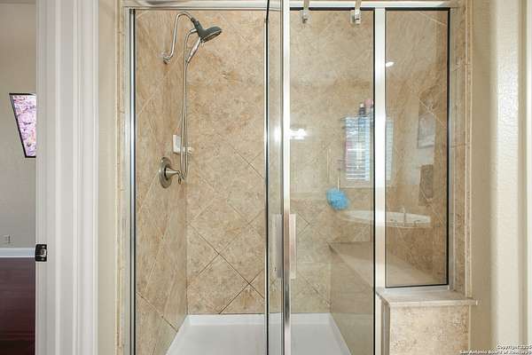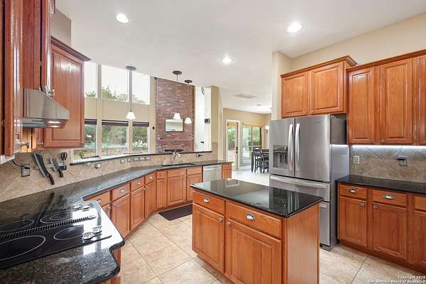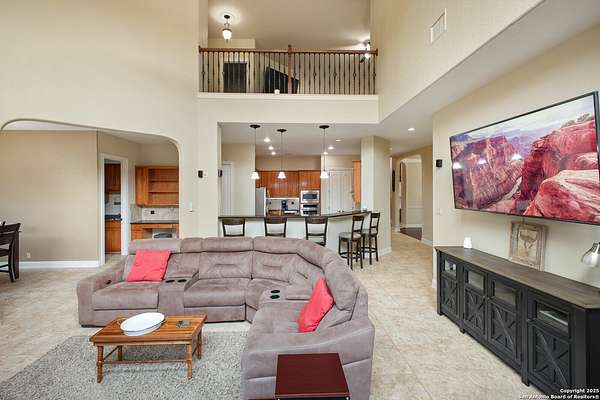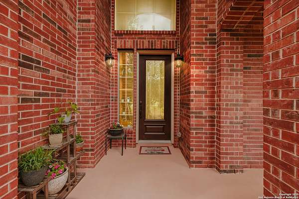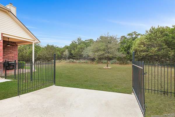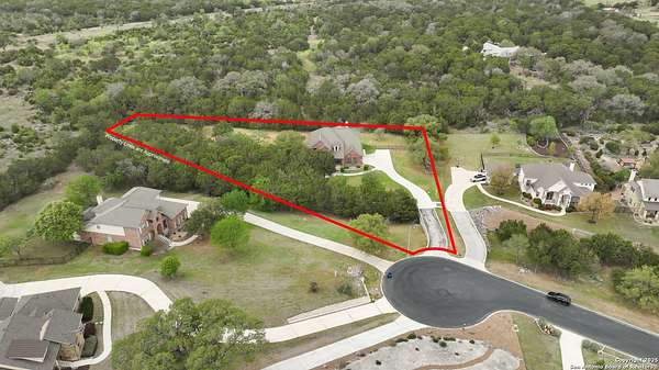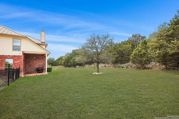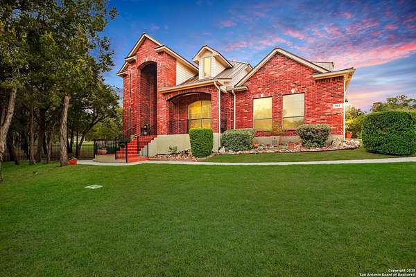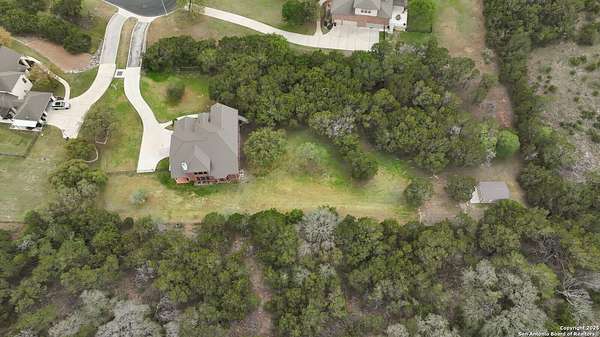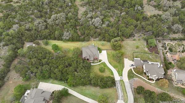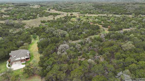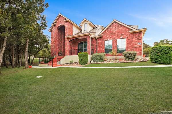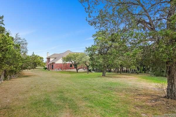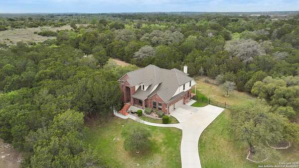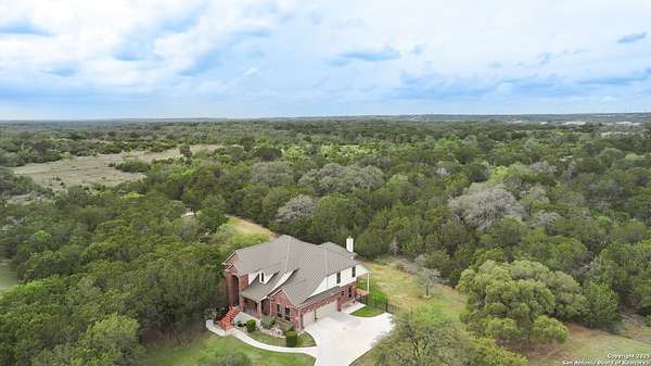 Tucked away in the exclusive gated section of Mission Hills Ranch, this stunning two-story home sits on a serene 1.6-acre lot, offering both privacy and picturesque Hill Country views. Backing to a private ranch, this home enjoys uninterrupted natural scenery with no rear neighbors. With 3,718 sqft of thoughtfully designed space, this home features a grand entry staircase, formal dining room, private office, and an expansive upstairs bonus room. A striking interior balcony enhances the open-concept design, creating a bright and inviting atmosphere. The primary suite on the main floor is a true retreat, while four additional bedrooms upstairs provide ample space for family and guests. Outside, the covered patio invites you to relax and enjoy the tranquil setting. A three-car side-entry garage adds both convenience and curb appeal. This home has been meticulously maintained and extensively upgraded, including a new metal roof (2020), multiple HVAC system updates (2019-2023), a radiant barrier for energy efficiency, and a whole-home ultraviolet air purification system. Smart features like WiFi thermostats and security cameras enhance modern living. Recent updates also include refinished cabinetry, stylish lighting and ceiling fans, a wine fridge, fresh paint, and new outdoor enhancements such as sidewalks and a spacious metal storage shed. Enjoy the perfect blend of luxury, privacy, and convenience, all within minutes of top-rated schools, shopping, and dining. Don't miss your chance to own this exceptional home in the heart of Mission Hills Ranch!