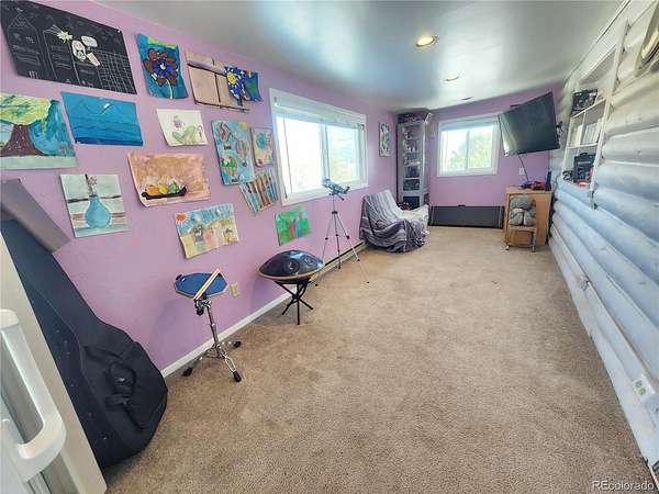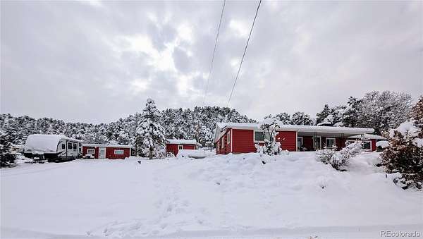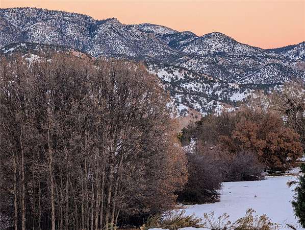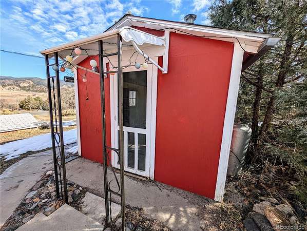 Nestled on 2.47 acres in the breathtaking mountains of Colorado and Bighorn Sheep Canyon, this one-level log home is a hidden gem offering comfort and functionality. Imagine sipping your morning coffee while relaxing on the screened-in porch, surrounded by the soothing sounds of nature. Just a stone's throw from the cabin lies a seasonal creek, adding a delightful touch to your mountain retreat. The property features beautifully designed flower beds and a fenced garden area. With a domestic well, it is easy to cultivate your dream garden and raise your baby goats. The outdoor patio, complete with pathways, invites you to enjoy the stunning views of Turkey Rock and the surrounding valley while basking in the tranquility of your surroundings.