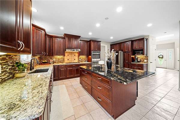 Beautiful estate home on 5 acres of land. This brick colonial features 5 bedrooms, 5 bathrooms, a three-car garage, walk out basement with a in law suit. Step inside the grand foyer and see vaulted ceilings, a beautiful chandelier and a gorgeous black and white stairway. Notice the large office and grand formal living and dining rooms. The spacious kitchen offers cherry cabinets and granite cooktops and large working and sitting island. The eat in kitchen also offers double ovens, pantry and deck access for outside entertaining. The beautiful grand living room has a feature wall complete with large picture windows overlooking the wooded back yard. There is a second stairway to the 2nd floor with landing overlooking the great room. The master suite offers a sitting room and updated master bathroom with granite counter tops walk-in shower and soaking tub. Four more spacious bedrooms share the other 2 full upstairs bathrooms. The walk out basement has a movie room with chairs from a real theater as well as a full in law suite complete with kitchenet, full bathroom, bedroom and massive recreation room. the 5 acre lot includes a large deck, lower level brick patio with hot tub and fire pit. This amazing estate home is priced to sell fast, set up an appointment before its gone!