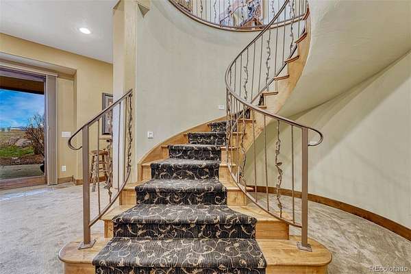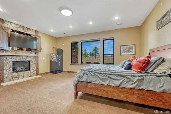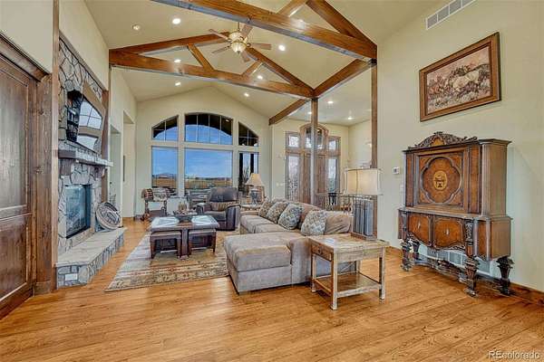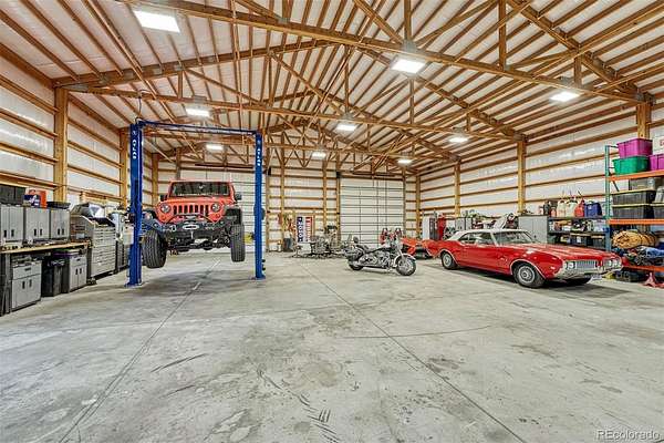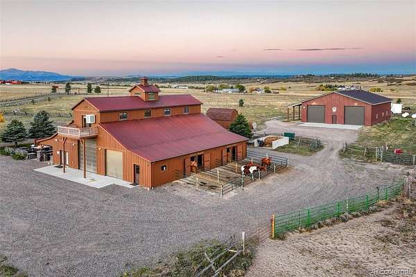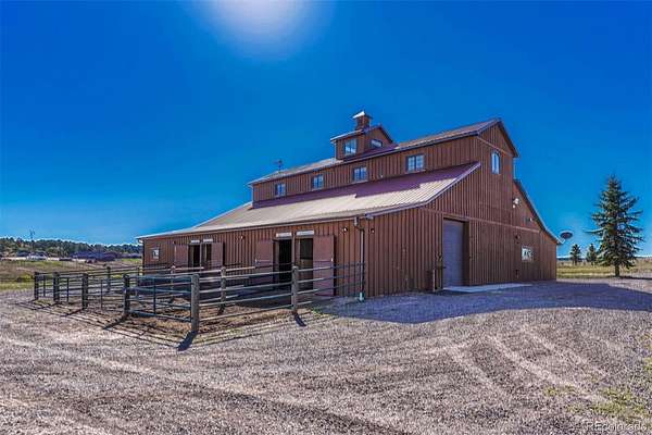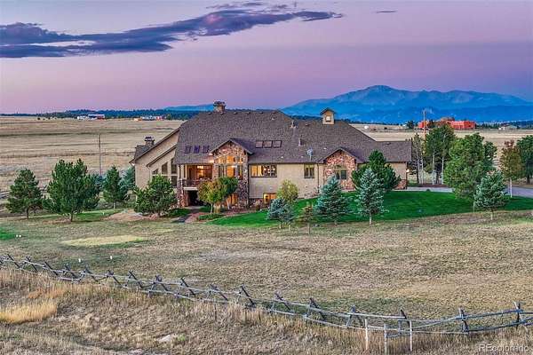Huge Pikes Peak views and sophisticated luxury meet turnkey ranch living. Exceptional property pairs high-end finishes with full equestrian infrastructure—beauty, function, and entertainment all in one. Land offers four fenced and cross-fenced pastures with auto-waterers & run-in sheds, seasonal pond, 150' x 200' arena, 4-stall barn with individual runs, tack room, and outdoor wash area. Fueling and equipment needs covered with above-ground diesel and gas tanks plus a full RV hookup. Main home blends ranch character with upscale design: hickory floors, alder cabinetry, natural stone, five fireplaces, and dramatic Australian waterfall granite. Grand etched-glass entry opens to a living room with soaring ceilings and hand-carved Douglas fir beams. Custom eat-in kitchen features exquisite granite and walks out to a covered dining patio with double-sided fireplace. Sweeping spiral staircase leads to the walk-out family room and bar. Light-filled hot-tub room offers a serene retreat. Primary suite includes a wood-burning fireplace, coffered ceiling, walk-in closet, bidet, freestanding tub, etched-glass shower, and dual vanities. Additional highlights: ambient lighting, lighted cabinets, whole-house filtration with softener, underground cement vault, commercial Starlink (120–140 Mbps), and multiple walk-outs. The barn’s entertainment wing features a commercial kitchen with custom cabinetry, Sub-Zero refrigerator, Viking range, stainless hood, and massive leathered-granite island. Gaming area leads to the outdoor kitchen with concrete counters, bar seating with fire feature, stainless appliances, sink, refrigerator, all-weather TV, paver patio, and firepit. Upstairs, the bunkhouse offers a living room, bathroom, built-in bunks, and access to the widow’s-peak cupola. Heated, insulated 50' x 72' shop adds serious workspace with room for 12 vehicles, water, power, and a full car lift. An exceptional property crafted for elevated ranch life—schedule your private viewing today.