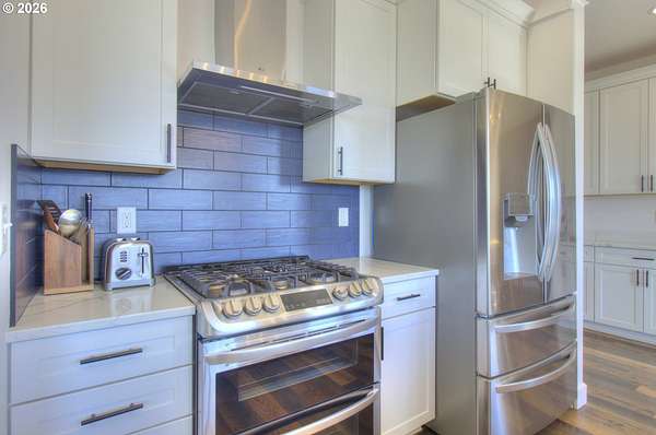 - Free Standing Gas Range, Free Standing Refrigerator, Island, Pantry, Range Hood, Stainless Steel Appliance