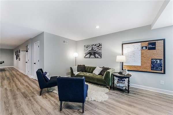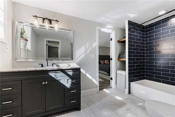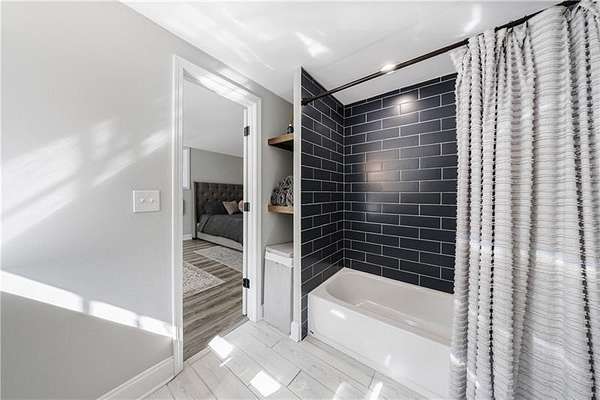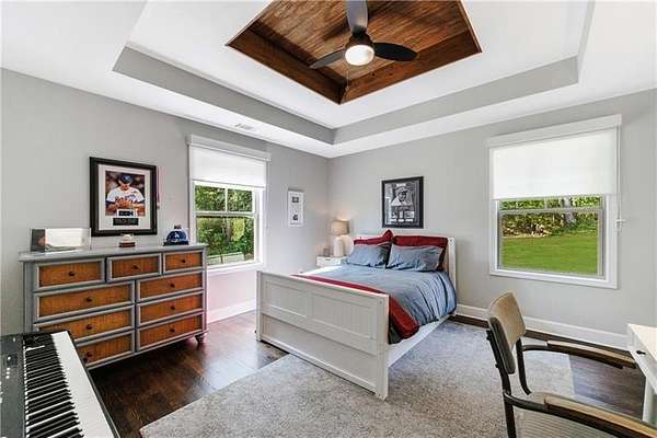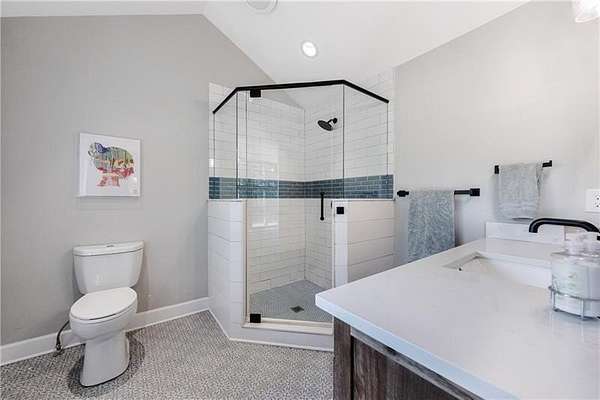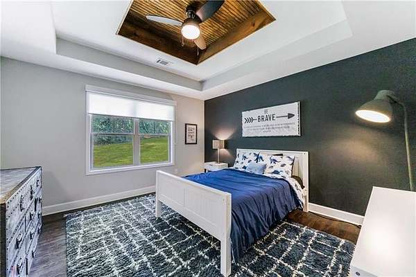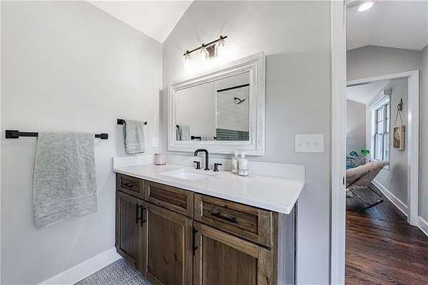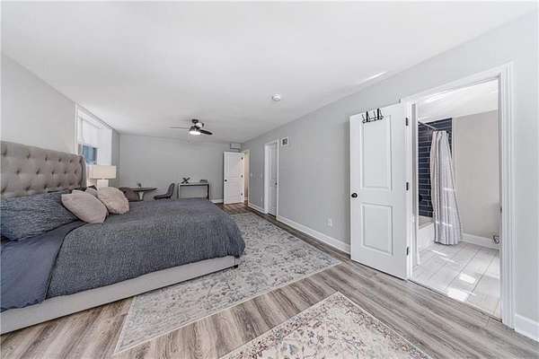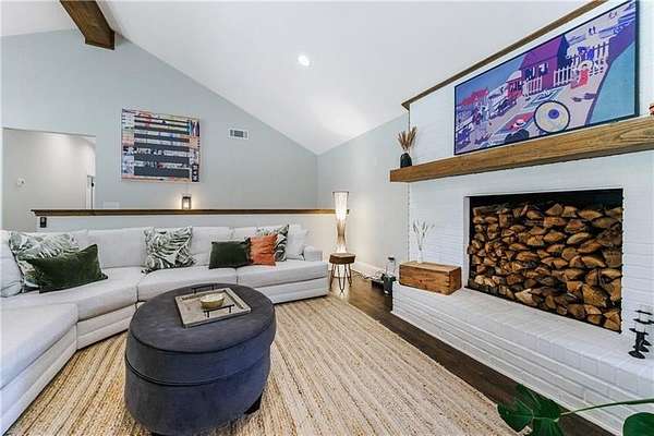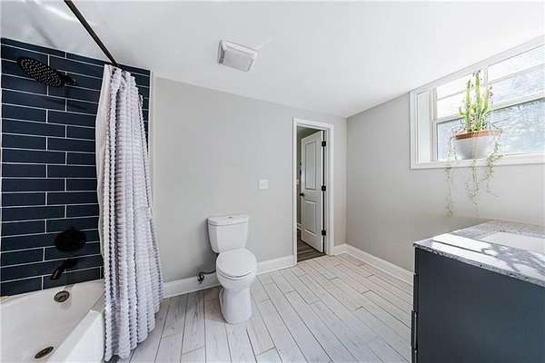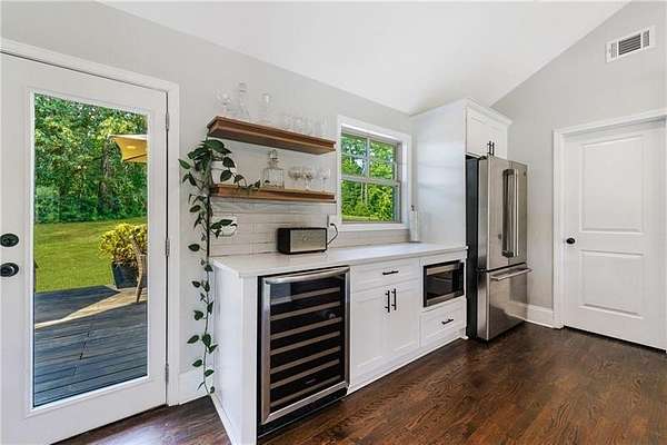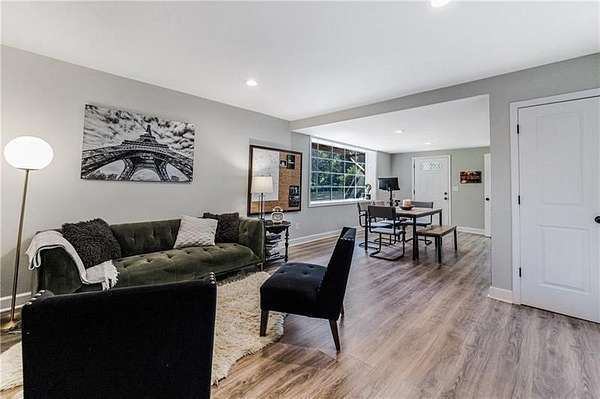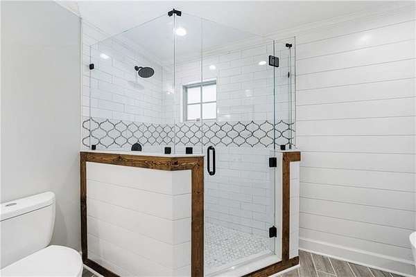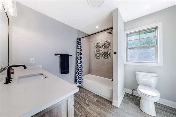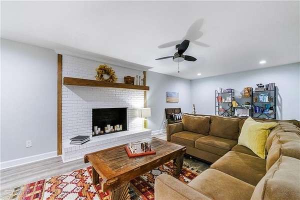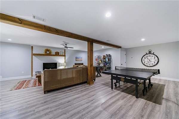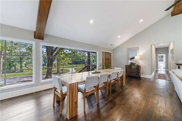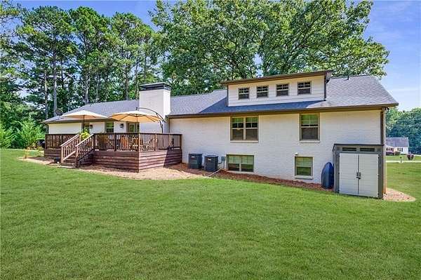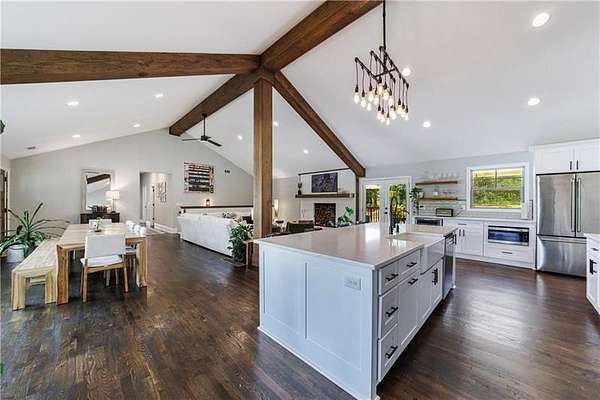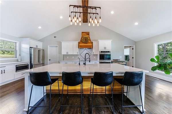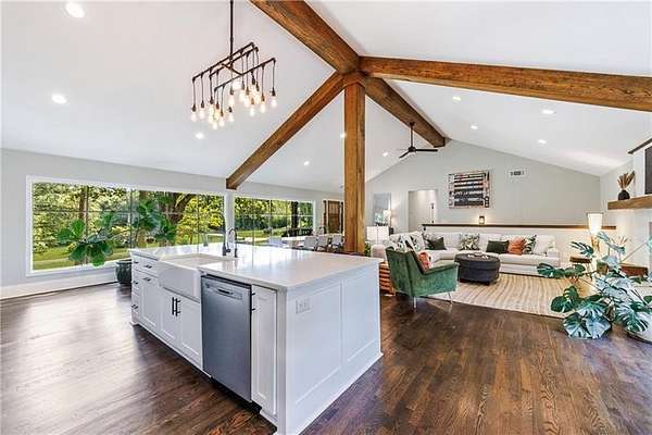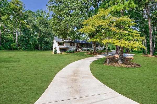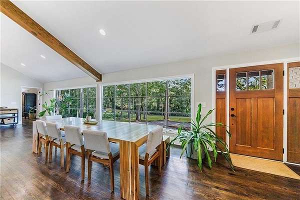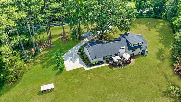 Welcome to this stunning, fully renovated oasis situated on 2.4 acres, just 3 miles from Serenbe and moments from Cochran Mill Park, home to over 20 miles of nature trails and multiple waterfalls along Little and Big Bear Creeks. This beautifully appointed brick home boasts an open-concept floor plan, finished terrace level, and modern finishes throughout. Upon entry, you're greeted by a spacious living area featuring vaulted ceilings with natural wood beams, hardwood floors, and oversized windows that frame stunning views of the surrounding greenery. The fireside living room, with its oversized brick fireplace, flows seamlessly into the dining room and kitchen. The remarkable kitchen features a stone-topped island with a breakfast bar and farm sink, white cabinetry, and stainless steel appliances, including a double oven, wine chiller, microwave, dishwasher, and refrigerator. The cooktop is enhanced by a natural wood vent hood, complementing the ceiling beams, open shelving, and wood fireplace mantel. The large primary suite offers a vaulted ceiling with wood accents and a spa-inspired bathroom, complete with a stone-topped dual vanity, oversized shower, and slipper tub. Three additional bedrooms, finished with equally stylish details, share two renovated bathrooms on the main level. The fully finished terrace level includes a second living area with a brick fireplace, an open flex space ideal for a game room, home office, or playroom, and a guest or in-law suite with an oversized bedroom, sitting area, and modern full bath. Outside, a large, peaceful deck overlooks the private, expansive yard with level grassy areas-perfect for entertaining, hosting events, or enjoying outdoor activities with family and friends as well as a chicken coop. This property offers ultimate privacy and a tranquil escape, with all the modern comforts just minutes from the vibrant community of Serenbe and less than 20 minutes from the airport.