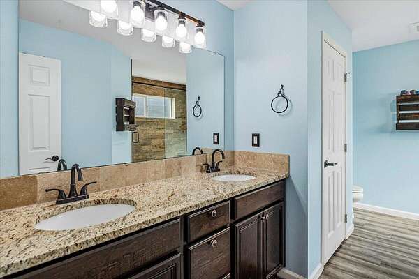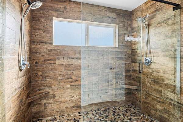 - Breakfast Bar, Ceiling Fan(s), Double Vanity, Linen Closet, Open Floorplan, Pantry, Primary Downstairs, Shower/Tub Combo, Tile Shower, Walk-In Closet(s)