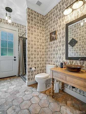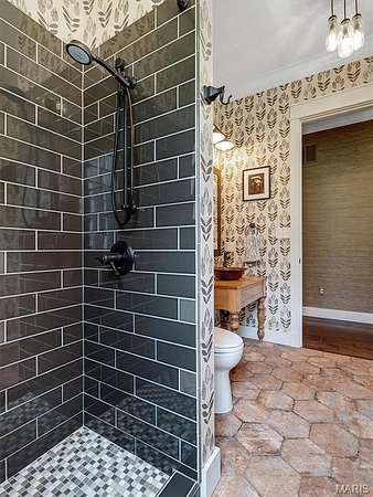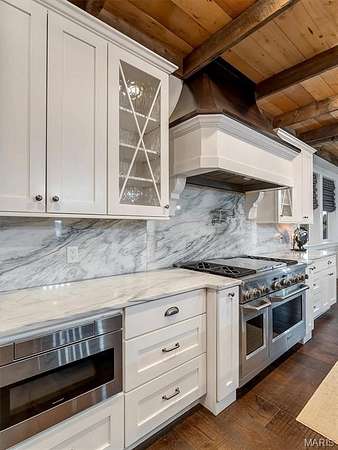 The kitchen is a rustic-modern masterpiece, featuring white shaker cabinets, dramatic marble-veined countertops and backsplash, a professional stainless steel range with a custom wood-and-white range hood, and a built-in microwave drawer. The huge dark-wood island with its thick butcher block counter offers an incredible space to gather and entertain.
