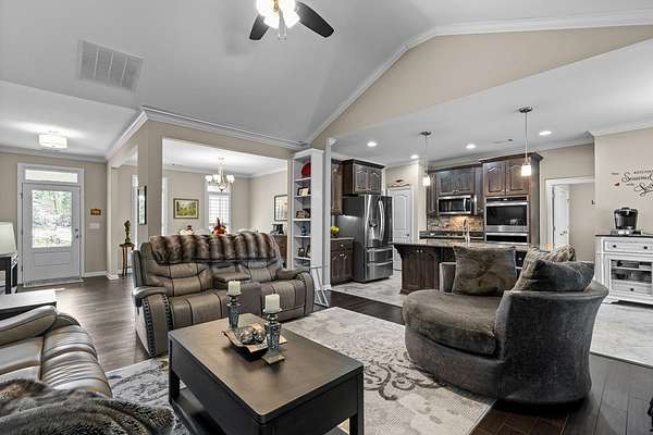 Welcome to full-time mountain living at 96 Morgan Trail in the desirable Lucky Hollow Farms subdivision. From the moment you arrive, you can feel the warmth, care, and thoughtful detail the sellers have poured into making this house a true home. The exterior features an attractive blend of brick, stone, and Hardie board siding with decorative shake accents, architectural shingles, shutters, gutters, and a welcoming front porch. A concrete driveway leads to the two-car garage, while purposeful landscaping, a fenced backyard with wrought iron posts and brick columns, and a tranquil koi pond with a waterfall creates a private outdoor retreat. Enjoy a seasonal mountain view that completes the mountain setting. Inside, the home offers a well-designed layout with a mix of tile, LVP flooring, and carpet, complemented by drywall interiors, crown molding, ceiling fans, and custom window treatments. The kitchen is equipped with beautiful cabinetry, granite countertops, a brick backsplash, stainless steel appliances, a double oven, cooktop, and a center island, along with a separate dining room ideal for entertaining. Additional highlights include a spacious laundry room, three bedrooms, two bathrooms, a cozy wood-burning fireplace, and a bright three-season room. The primary suite features a walk-in shower, while the secondary bathroom includes a tub/shower combination. This well-maintained home offers comfort, quality, and timeless mountain charm.
