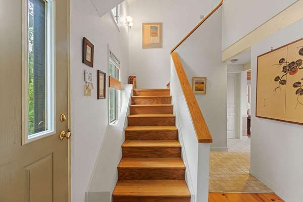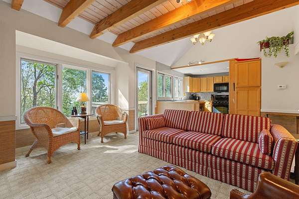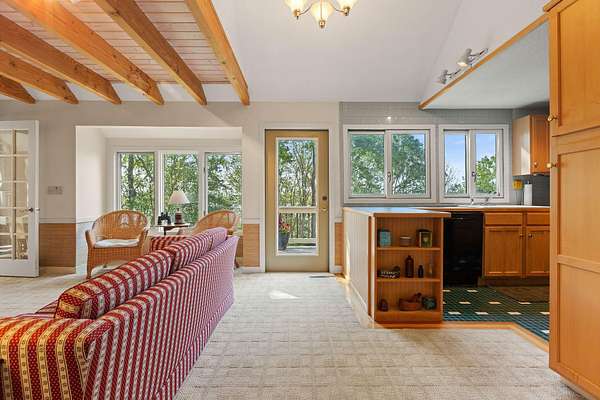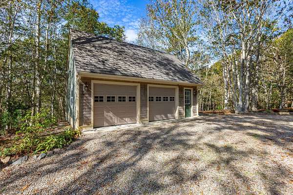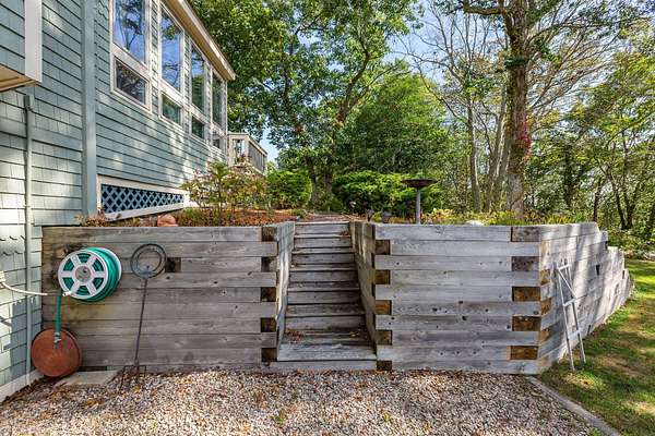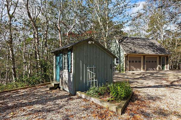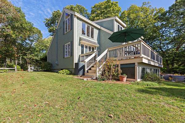Nestled on 2.1 private acres with 225 feet of frontage on picturesque Mashpee-Wakeby Lake with private dock, this distinctive mini-estate offers the ideal year-round residence or serene getaway. The 3BR, 2BA, 2,364 sq ft home sits elevated above the water, offering sunrise and sunset views from every room. Enjoy two expansive decks with Azek decking, a sunroom, and a finished walkout level with a second kitchen and laundry. The living room boasts a beamed ceiling and wood stove, while the family/library room features custom built-ins. The detached 2.5-car garage is insulated and includes a workshop. A 420 sq ft finished studio with skylights and propane heat offers space for work or leisure. Additional features include a garden shed with power, central A/C, propane heat, new electrical, deep well, and a 2023 Title V septic. Perennial gardens and a woodland path lead to a private deck and seasonal dock-perfect for boating, fishing, and swimming on one of the Cape's most coveted lakes. Buyers and Buyers agents to confirm all information contained herein.