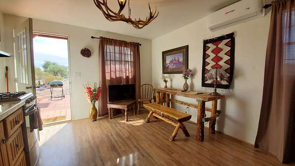 Beautiful views and Quiet enjoyment! 3BR/2ba affixed manufactured home sits on 2 acres with stunning views of the Sonoran Desert. Approx 1900sq ft. The main home offers 2BRs and a full bath at the south end of the home and the north end you will find the Master Suite and a full bath. In between are the family and formal living rooms, dining room with sliders going out to the covered patio. Plenty of room in the kitchen for a breakfast nook. Large inside laundry room with ample space for an extra refrigerator or freezer. The back patio is covered for outside enjoyment and offers a jacuzzi surrounded by a privacy fence. Several outbuildings are on the property for extra storage. Located on the eastside of the acreage is the tiny home. The home is a 1 BR/1bath fully furnished home. There is a long-term tenant in place at the present but has potential to make a great Airbnb or mother-in-law quarters. There is a roomy loft that accommodates two twin beds and additional storage. The rear of the home offers ample space to install a washer and dryer. Bring your finishing touches and make this your Oasis in the desert.