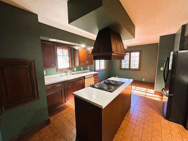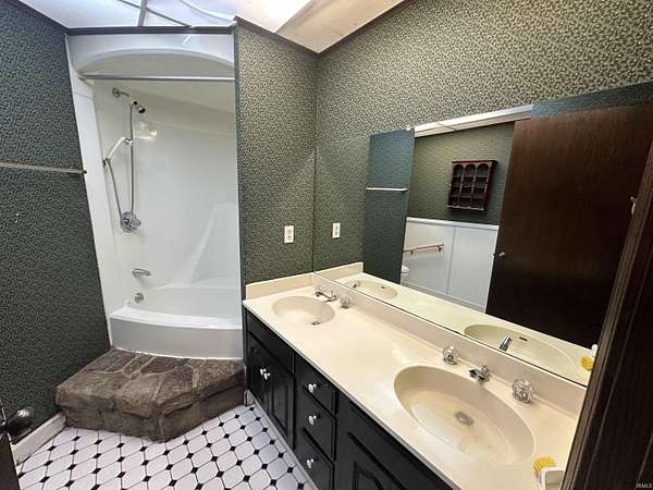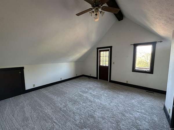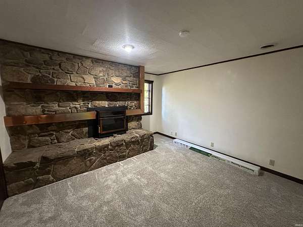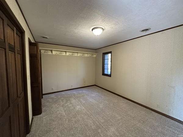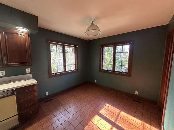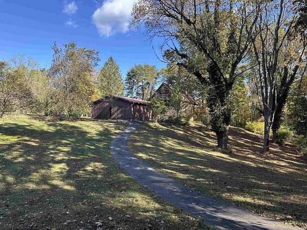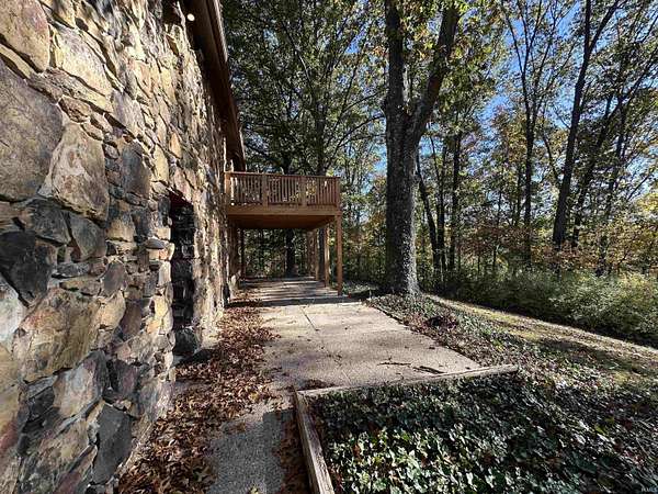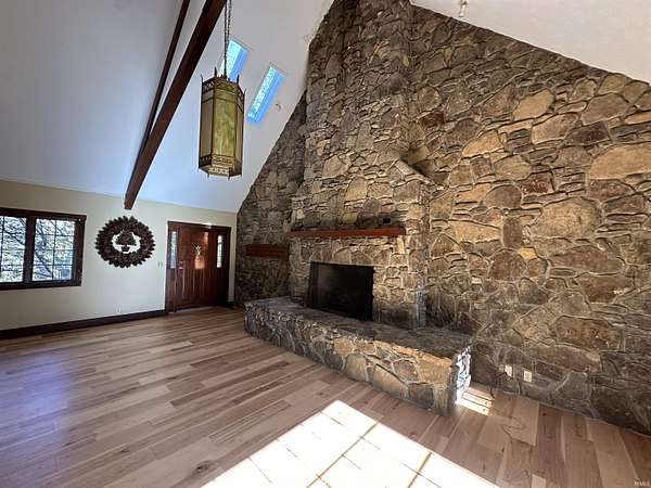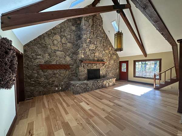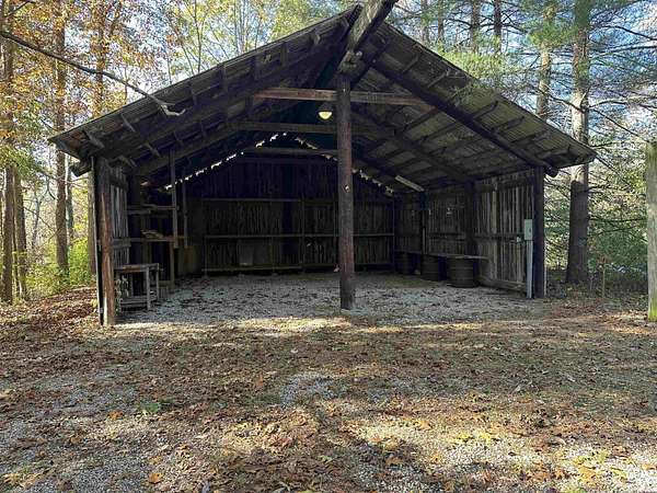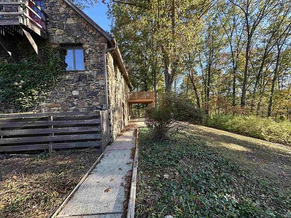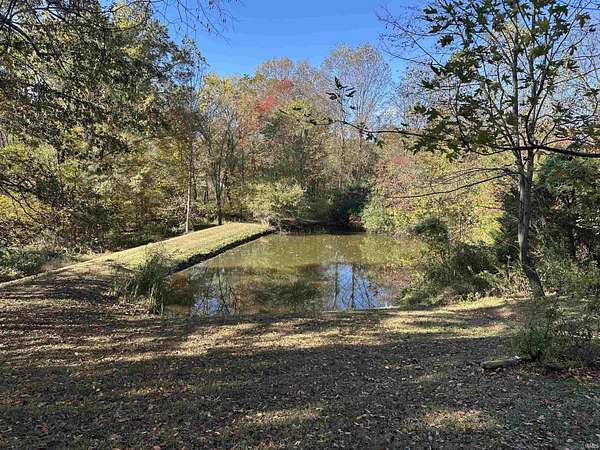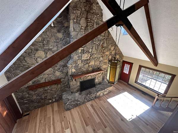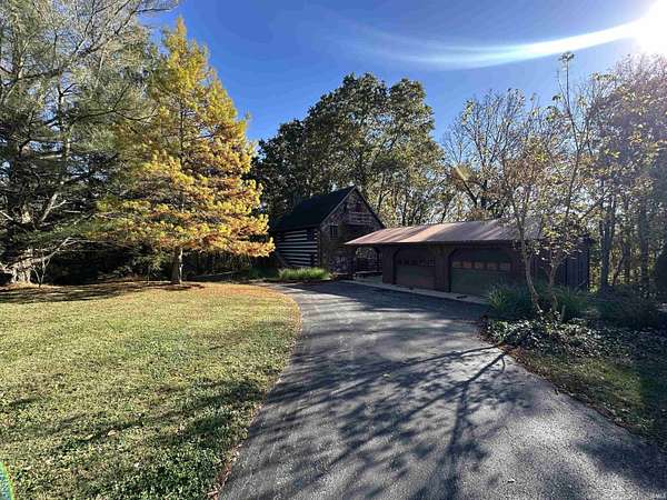 This impressive 2 1/2 -story log and stone home sits atop a beautiful 7-acre hilltop, offering total privacy, a sweeping paved drive, and panoramic valley views, just 15 minutes from Bloomington's east side. Every detail showcases quality and craftsmanship, from the hand-laid stonework to the peaceful natural surroundings. The land is stunning, with rolling lawns, mature trees, a serene pond, and a large barn ideal for equipment, hobbies, or animals. This property is a true nature retreat. Inside, the great room features a soaring vaulted ceiling with exposed beams, a massive two-story stone fireplace, and new hickory flooring. The dining room includes a wall of built-ins and new flooring, while the eat-in kitchen offers cherry cabinetry, all appliances, and an electric dumbwaiter. The upper-level primary suite has vaulted ceilings, full bath and attic access. Built with over 90 tons of stone, this home was designed for strength and efficiency, featuring R-22 insulated walls, R-35 ceilings, Andersen windows, reinforced walls, and 400-amp electric service. A 28x30 detached garage with carport completes this timeless estate surrounded by nature's beauty.