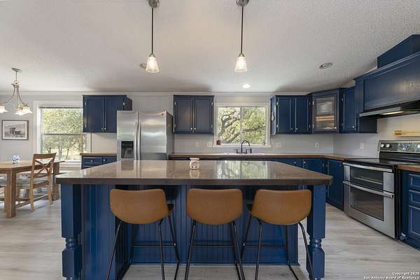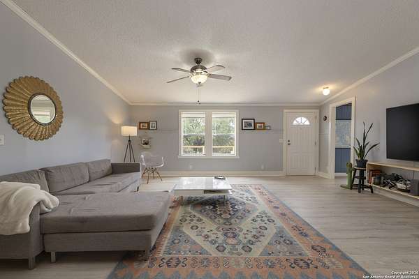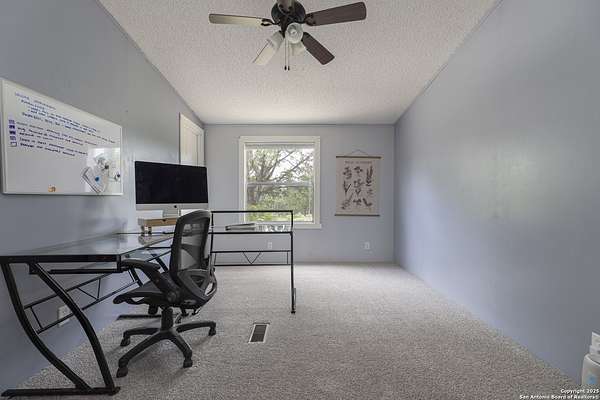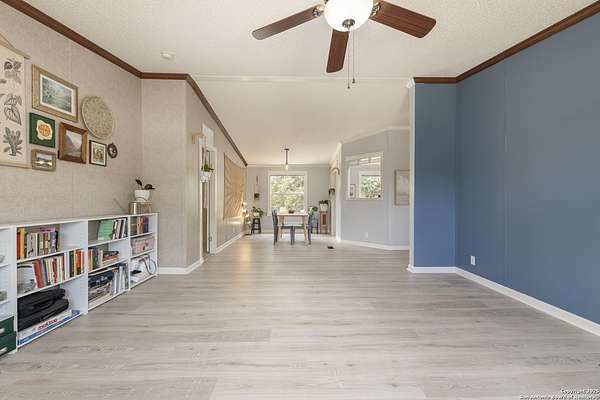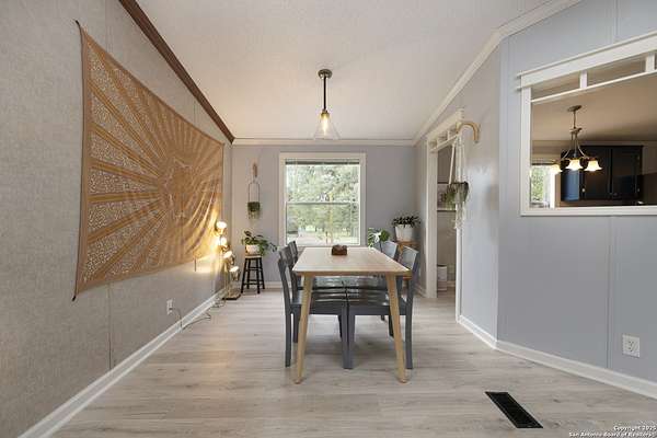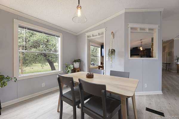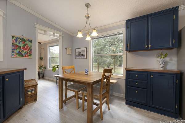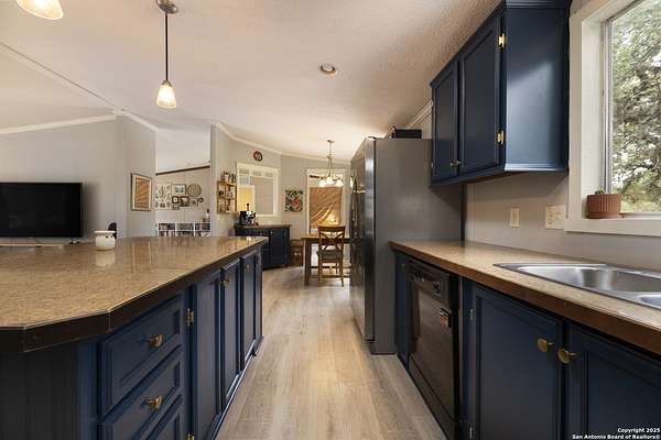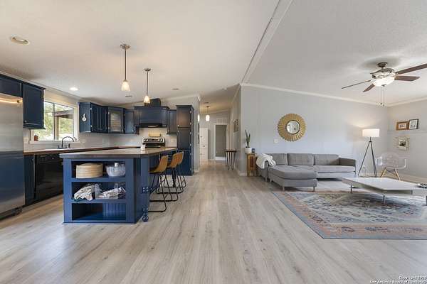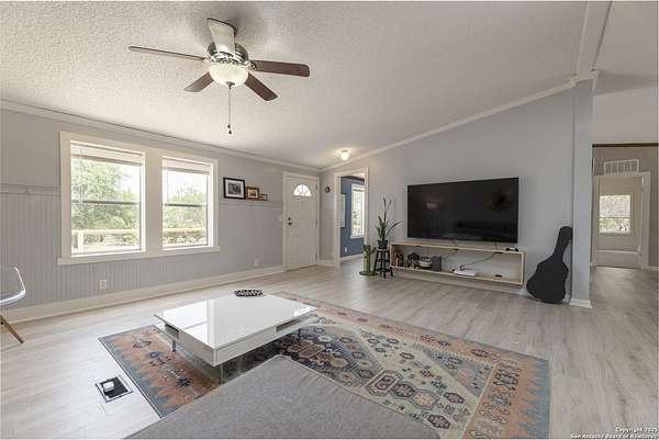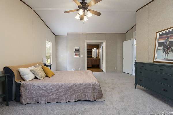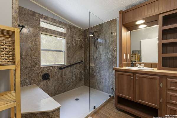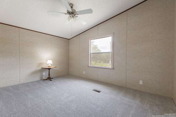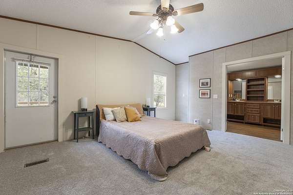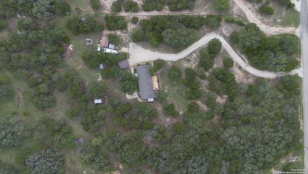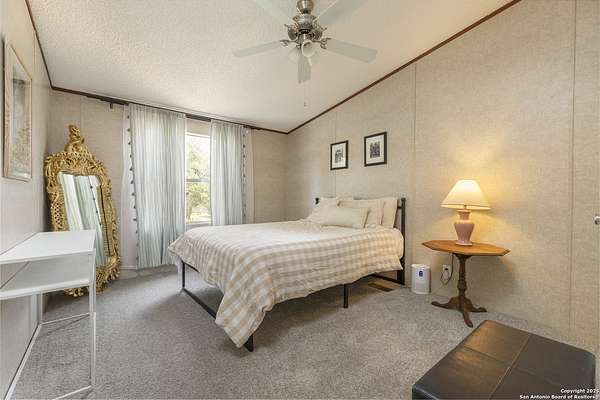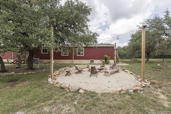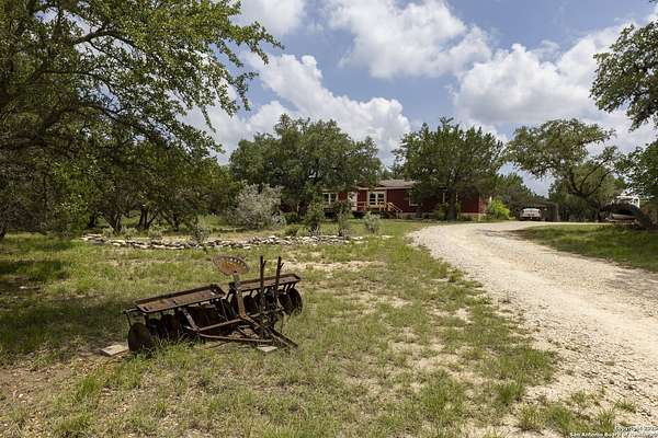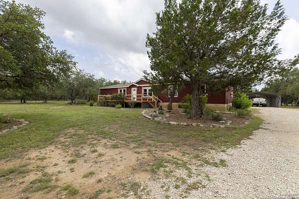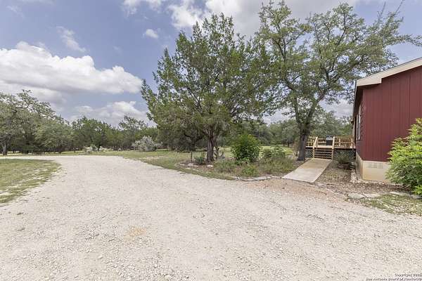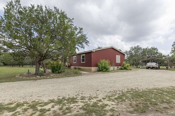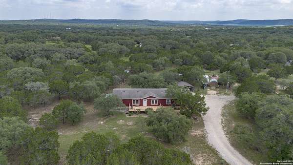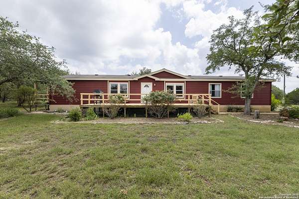 Peaceful Hill Country living on 5.14 private, fully fenced acres! This 4-bed, 2-bath, 2,356 sq ft manufactured home (FHA/VA ready) features an open-concept kitchen, two living areas, and two dining spaces. The oversized primary suite includes private outdoor access, a walk-in closet, and a wheelchair-accessible walk-in shower. Secondary bedrooms offer generous space for family or guests. Enjoy wildlife views from the large front porch or the covered back patio. The property includes a covered carport, multiple open and enclosed sheds, a fire pit area, and primarily flat land-perfect for horses, cattle, or a workshop. A brand-new AC unit was installed this year for year-round comfort. Located in a quiet, gated community near Medina Lake with no HOA restrictions. Ideal for retirees, homesteaders, remote workers, or anyone seeking space and privacy. Beautiful night skies, mature live oaks, and room to spread out-don't miss this rare Hill Country retreat.
