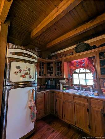 Escape to the peace and charm of this beautiful 2-bedroom solid log cabin, perfectly nestled in a serene, wooded setting with a picturesque pond sitting on almost 9 acres. Crafted with authentic logs and classic chinking, this cabin offers rustic character paired with a warm, inviting atmosphere. Kitchen holds vintage look refrigerator and stove, bathroom has claw foot tub with shower. Relax on the spacious front porch overlooking the pond, where you can enjoy morning coffee, watch wildlife, or unwind with stunning nature views. Surrounded by trees and natural beauty, lots of perennial flowers and shrubs, planted with the blooming seasons in mind. The barn (24 x 28 x 16) and outbuilding are uniquely crafted with barn wood. You'll stay warm with the stone laid fireplace. Whether you're looking for a weekend getaway, vacation rental opportunity, or full-time residence, this charming cabin delivers the ideal blend of rustic living and peaceful surroundings. Don't miss the chance to own your own wooded retreat with a soothing water view.