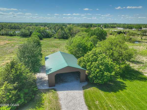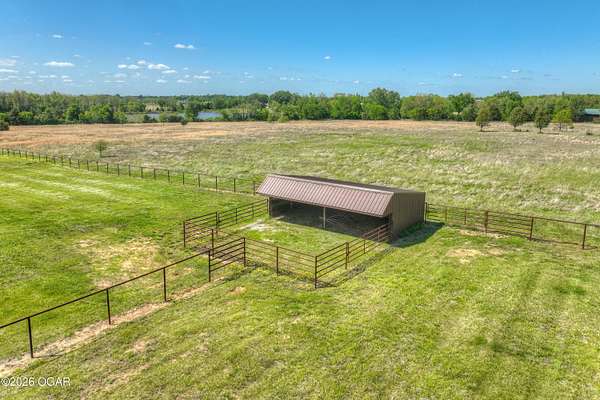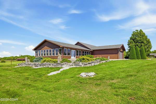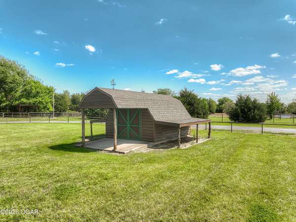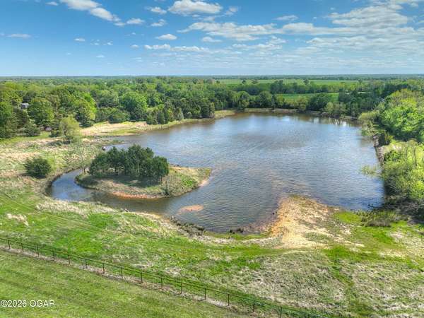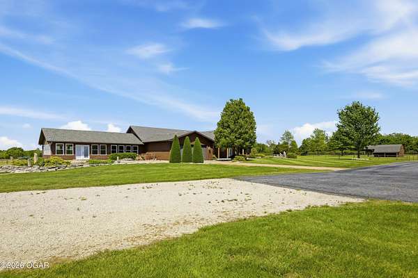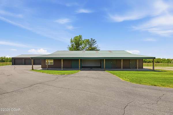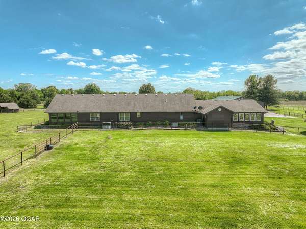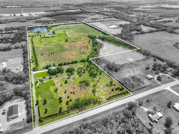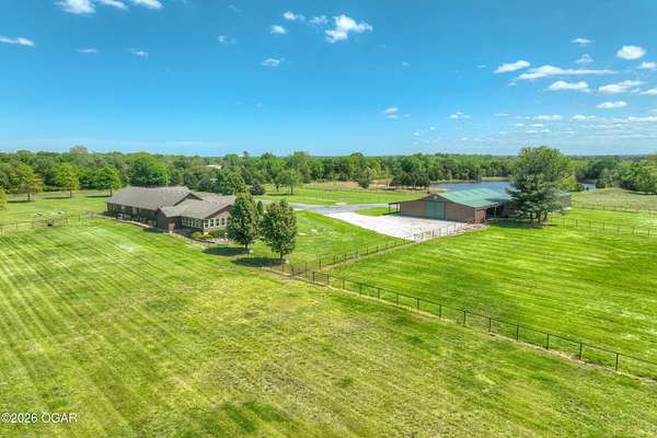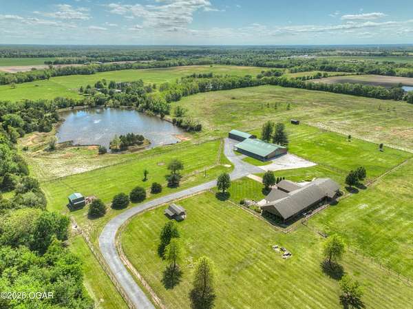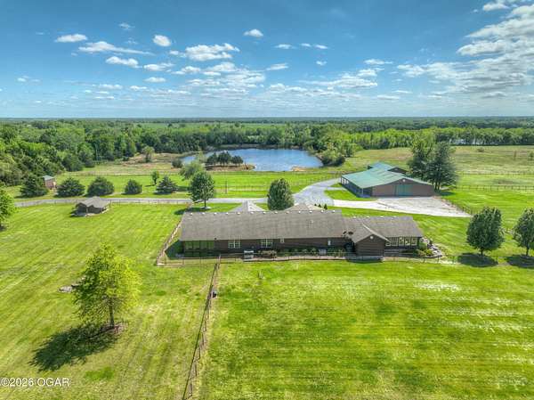 Pristine acreage located just north of Joplin off Hwy 96, offering an ideal setup for livestock and equestrian use. This beautiful property features piped fencing, automatic waterers, multiple paddocks, numerous loafing sheds, and a well-designed horse barn that includes full living quarters. Two fully stocked lakes/ponds provide both recreation and functional water sources for livestock. The spacious home offers open living areas with large windows overlooking the surrounding farm, creating a bright and inviting atmosphere. The residence sits well back from the road, providing exceptional privacy and peaceful views in every direction. There are far too many features to list here -- a complete amenities sheet can be provided upon request. Property may also be purchased with less acreage to suit buyer needs.