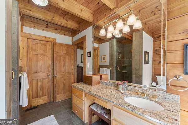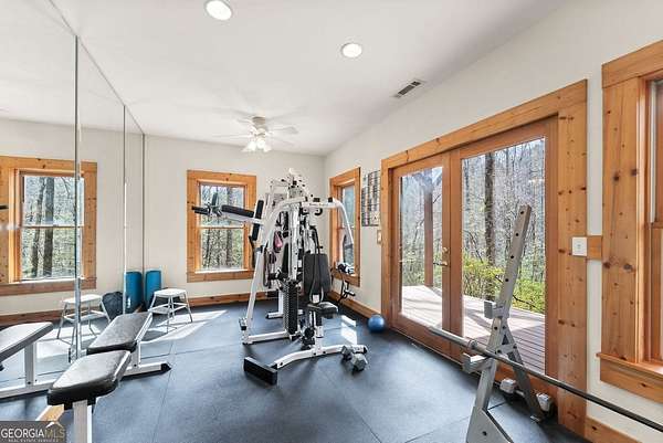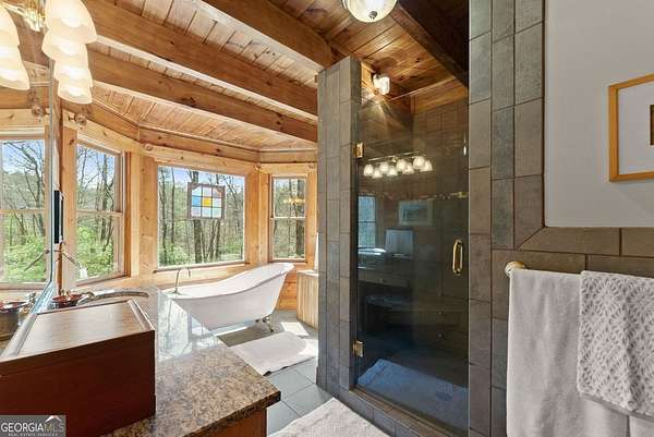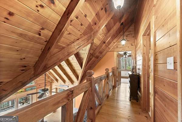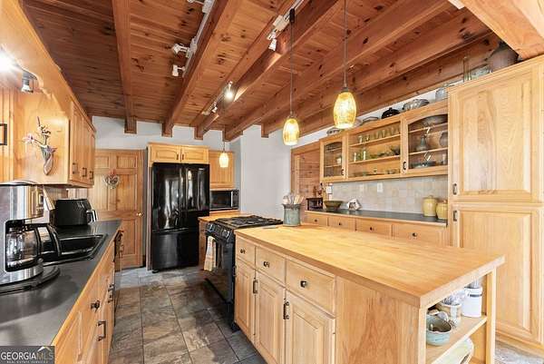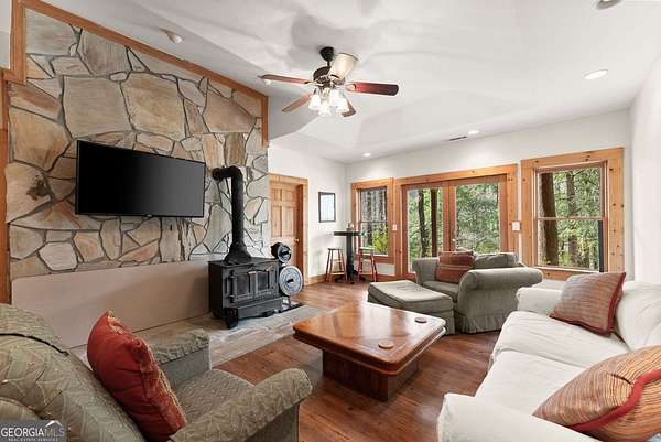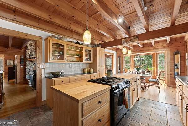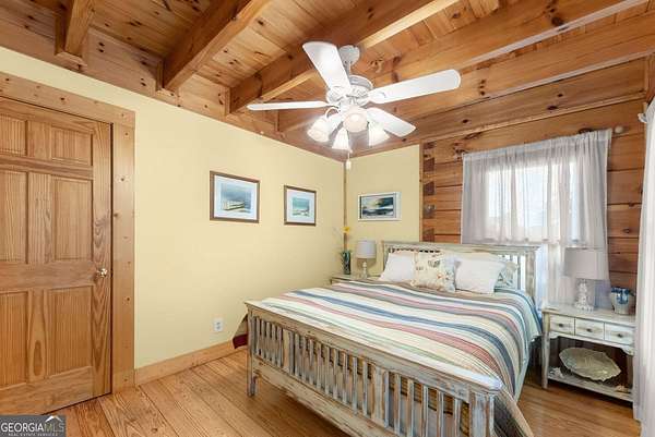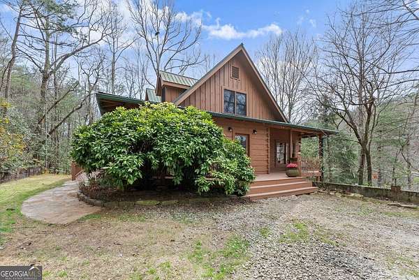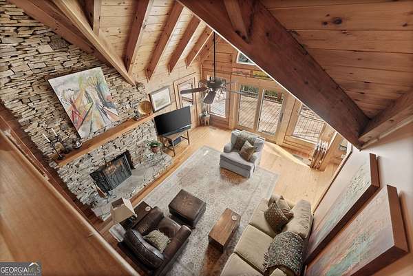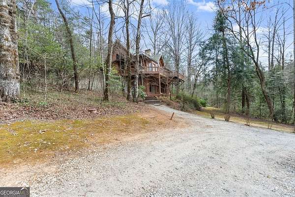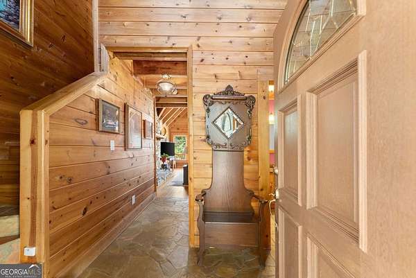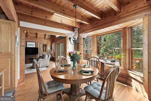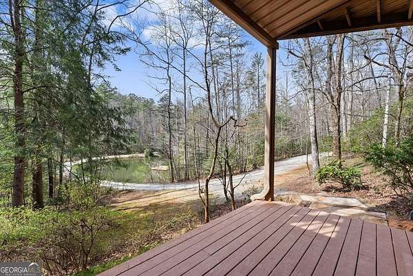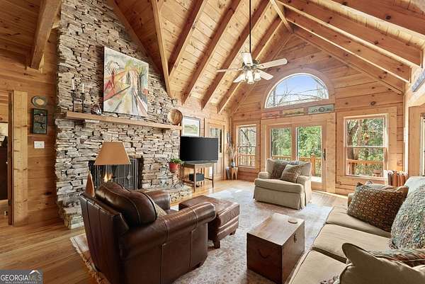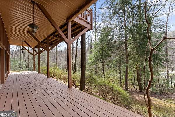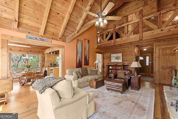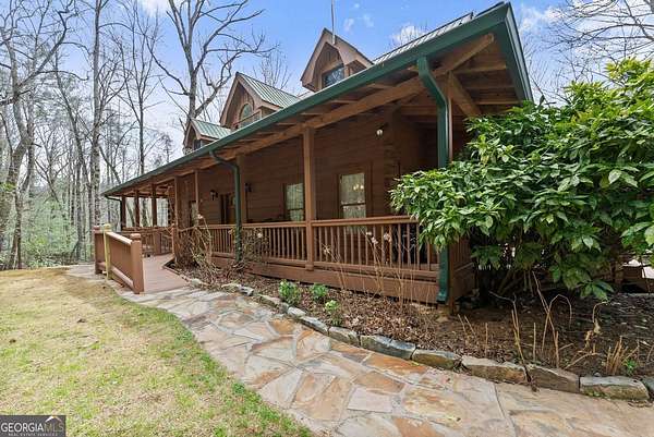 4BD, 4BA Cabin on 12.10 Private Acres with Pond and Dock. Tucked away in a peaceful, wooded setting, this property offers a blend of privacy, usable acreage, and natural beauty. The 12.10-acre tract features a private pond with dock, ideal for fishing, relaxing, or enjoying the surrounding landscape. The home showcases rustic character with hardwood floors, tongue-and-groove paneling, stacked stone fireplace, and exposed beam ceilings, creating a warm and inviting interior. The home features covered porches designed for year-round outdoor living as well as a sun deck and veranda overlooking the pond. The kitchen is functional and open to the dining area, featuring a butcher block island and ample workspace. The primary suite includes a clawfoot soaking tub and tiled shower, while additional baths are finished with granite countertops. An additional flex space is suitable for a home office, gym, or hobby room. With a balance of open space and wooded privacy, this property is well-suited for a full-time residence or weekend retreat, offering a quiet setting with room to expand or explore.