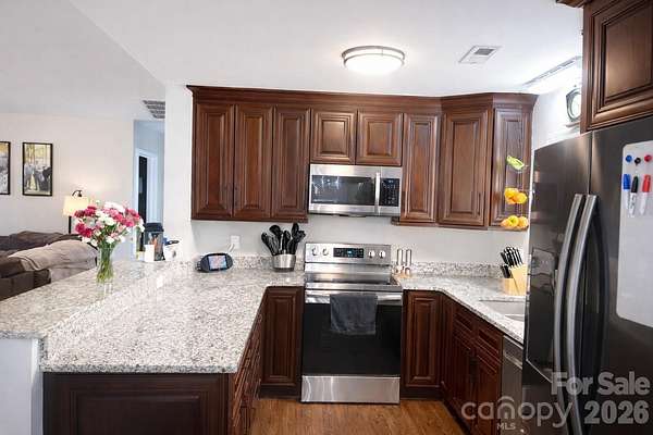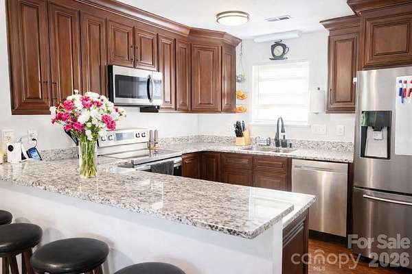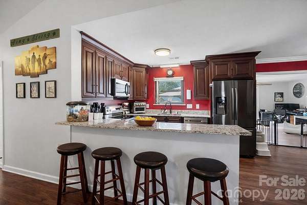 Welcome home to space, upgrades, and privacy - all on 1.94 acres in desirable Harrisburg, NC. From the moment you arrive, you'll appreciate the setting - positioned on a spacious lot surrounded by mature trees, offering both room to roam and peaceful views. Inside, the vaulted living room features rich flooring, abundant natural light, and a striking brick fireplace as the focal point. The open layout flows into the beautifully remodeled kitchen (2021) showcasing granite countertops, custom cabinetry, stainless appliances, and bar seating - ideal for everyday living and entertaining. The dining space connects seamlessly to the main living areas, creating a warm, inviting layout. The primary suite offers a true retreat, complete with a spa-style bathroom (finished in 2026) featuring a freestanding soaking tub and designer finishes. A custom walk-in closet provides exceptional storage and organization. Major upgrades provide long-term peace of mind: - Dual Zone HVAC with heat pack updated in 2021 - Halo REME air purifier installed in 2022 - Water softener & filtration system installed in 2021 - Propane tankless water heater installed in 2022 - Septic tank replaced with larger tank & inspected in 2024 - Most plumbing upgraded to PEX - Exterior painted in Aug 2024 - Carpet replaced in 2025 Outdoor living is where this property truly shines. The expansive deck replaced in 2002 includes multiple entertaining areas, and views of the above-ground pool and custom pool deck (2022). A playground area and trampoline will convey with right offer and adds even more functionality to the backyard space. And the bonus feature buyers will love - a large detached shop with multiple garage bays, ideal for car enthusiasts, hobbyists, storage, or workshop space. With nearly 2 acres, a detached shop, updated systems, and incredible outdoor entertaining space - this Harrisburg property offers flexibility, functionality, and lifestyle all in one. Schedule your private showing today.